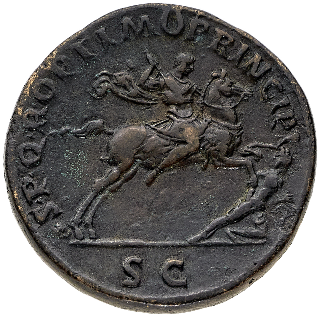 Sesterzio databile al periodo 103-111 d.C. - Zecca: Roma - Diritto: testa laureata dell'Imperatore a destra con un accenno di drappeggio sulla spalla sinistra - Rovescio: Traiano a cavallo verso destra nell'atto di trafiggere un Dace sotto il cavallo - gr. 23,27 - BB