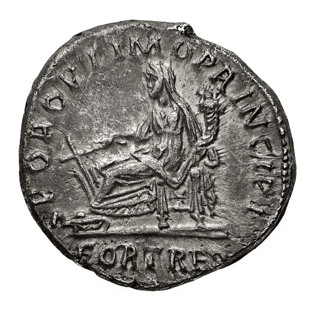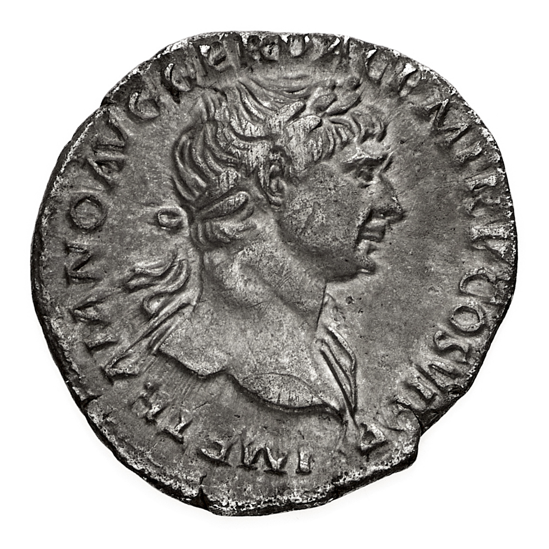 Denario databile al periodo 113-114 d.C. - Zecca: Roma - Diritto: testa laureata dell'Imperatore a destra con un accenno di drappeggio sulla spalla sinistra - Rovescio: la Fortuna seduta a sinistra tiene un timone con la mano destra e una cornucopia con la sinistra - gr. 3,08 - q.SPL