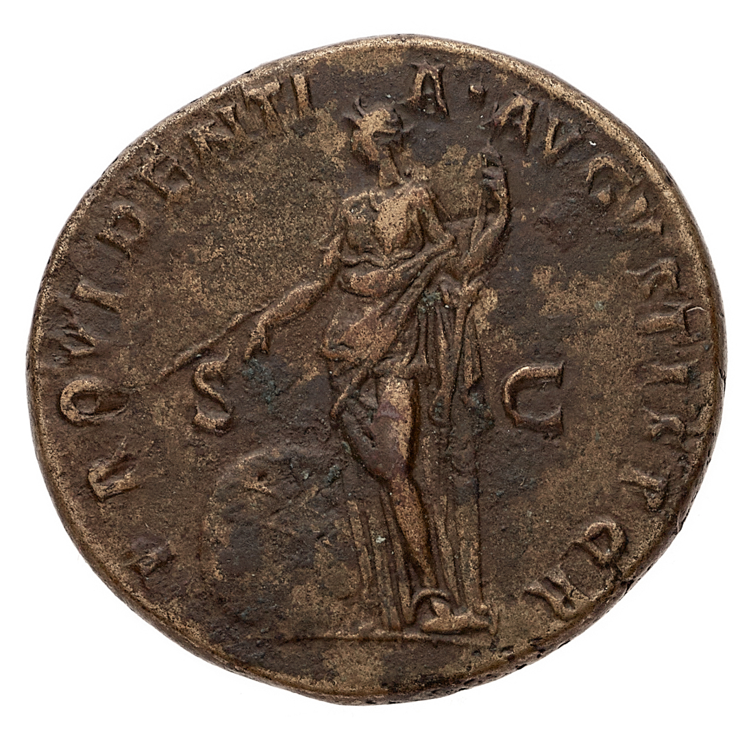 Dupondio databile agli anni 116-117 d.C. - Zecca: Roma - Diritto: busto radiato e drappeggiato dell'Imperatore a destra - Rovescio: la Providentia stante a sinistra tiene una bacchetta con la mano destra e una lancia con la sinistra; in basso a sinistra un globo - gr. 11,16 - BB