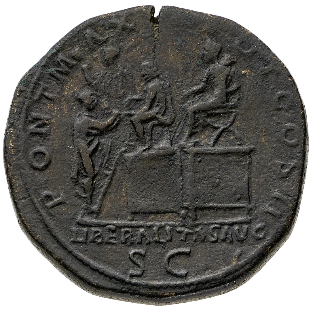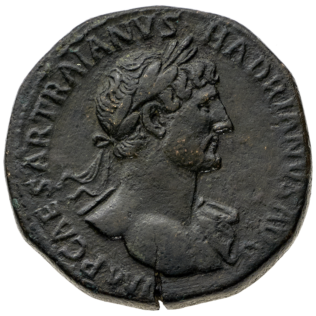 Sesterzio databile al 118 d.C. - Zecca: Roma - Diritto: busto laureato dell'Imperatore a destra con un accenno di drappeggio sulla spalla sinistra - Rovescio: l'Imperatore seduto a sinistra su una piattaforma; di fronte a lui un ufficiale seduto nell'atto di distribuire doni a un cittadino; sullo sfondo la statua della Liberalitas - gr. 22,36 - Rara - Frattura di conio e lievi ritocchi, BB