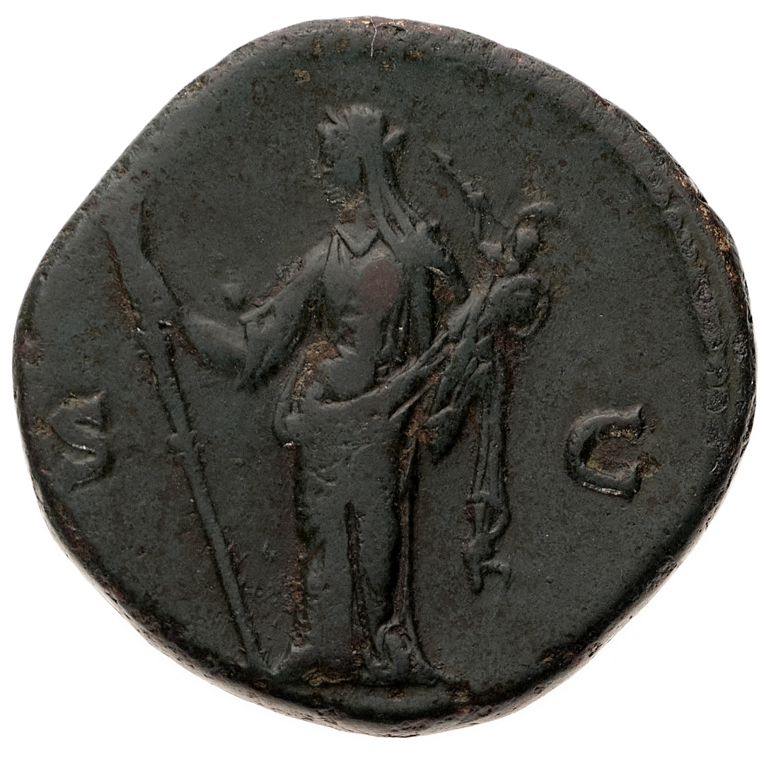 Sesterzio al nome e con l'effigie di Faustina Senior, moglie dell'Imperatore, databile al 141 d.C. - Zecca: Roma - Diritto: busto drappeggiato e diademato di Faustina a destra - Rovescio: Minerva stante a sinistra, tiene un lungo scettro con la mano destra e un palladium con la sinistra - gr. 23,47 - Gradevole patina verde, BB