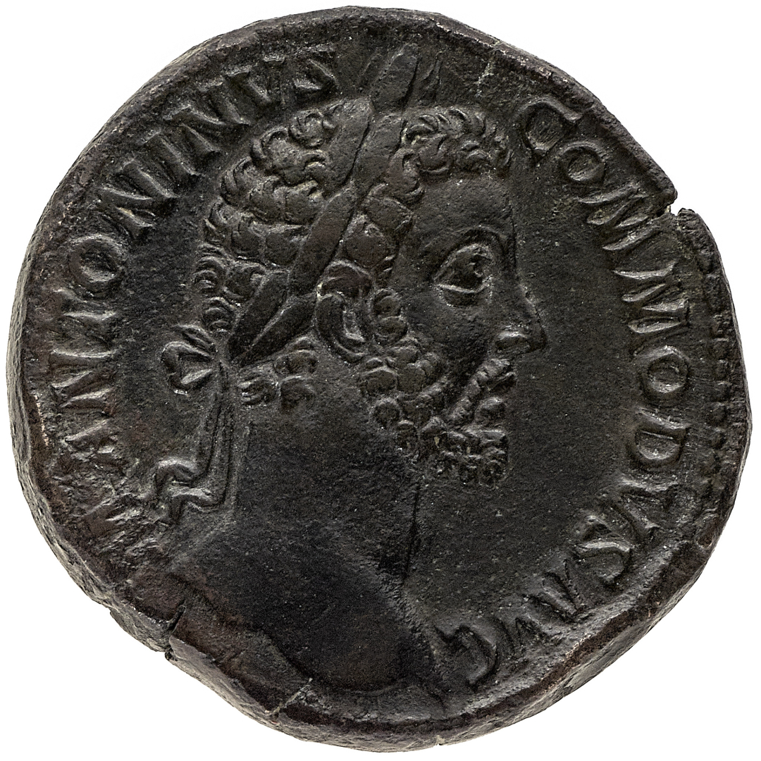 Sesterzio databile al 181-182 d.C. - Zecca: Roma - Diritto: testa laureata dell'Imperatore a destra - Rovescio: Roma stante a sinistra tiene una piccola Vittoria con la mano destra e uno scettro con la sinistra - gr. 28,30 - Lievi ritocchi, migliore di BB - Proveniente dalla collezione Signorelli, asta Santamaria, Roma 13.3.1953, n. 598