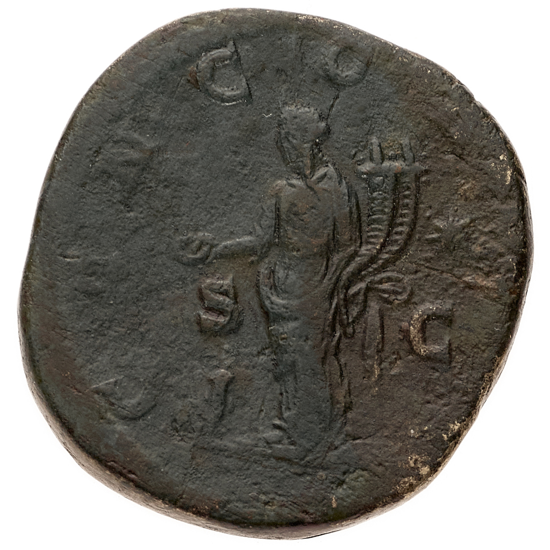 Sesterzio al nome e con l'effigie di Aquilia Severa, seconda moglie dell'Imperatore - Zecca: Roma - Diritto: busto diademato e drappeggiato di Aquilia Severa a destra - Rovescio: la Concordia stante a sinistra tiene una doppia cornucopia con la mano sinistra; con la destra versa il liquido sacrificale da una patera su un'ara accesa ai suoi piedi; nel campo a destra una stella - gr. 22,68 - Rara - Lievi ritocchi, q.BB