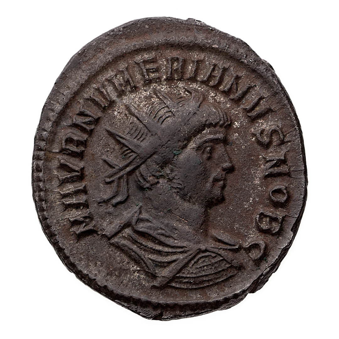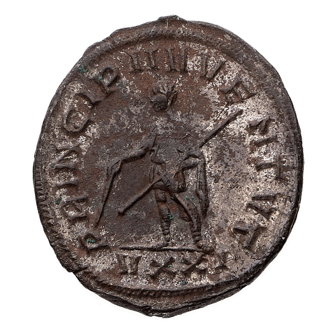 Antoniniano - Zecca: Ticinum - Diritto: busto radiato, drappeggiato e corazzato dell'Imperatore a destra - Rovescio: l'Imperatore stante a sinistra tiene con la mano sinistra un lungo scettro e con la destra una bacchetta - gr. 4,08 - Tracce di argentatura, q.SPL - In lotto con un Antoniniano di Numeriano di qualità leggermente inferiore - Proveniente dalla collezione Signorelli, asta Santamaria, Roma 13.3.1953, n. 1292 e corredata da cartellino di antica collezione