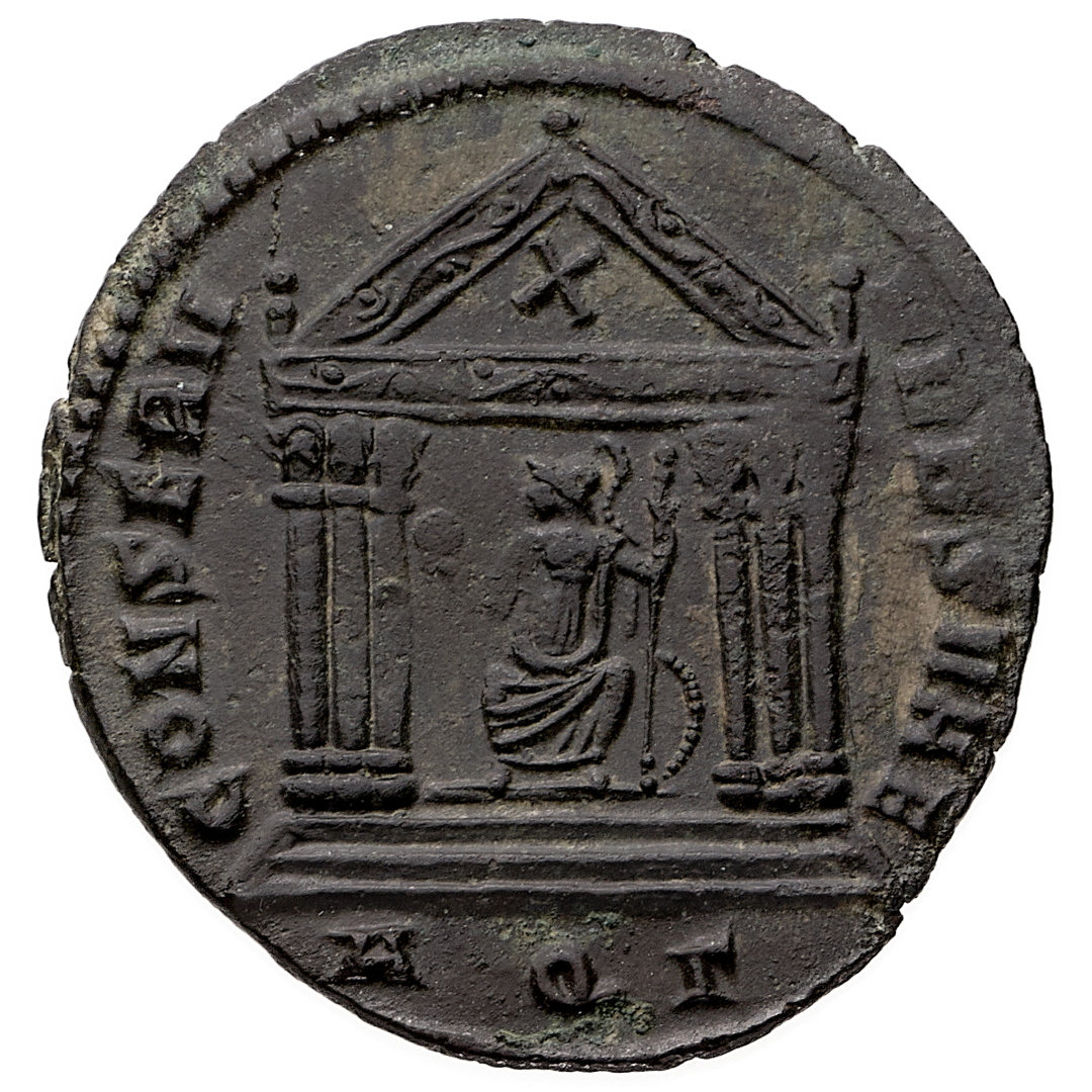 Follis databile al periodo 307-310 d.C. - Zecca: Aquileia - Diritto: testa laureata dell'Imperatore a destra - Rovescio: Roma seduta con il volto a sinistra all'interno di una tempio a sei colonne, tiene un globo con la mano destra e uno scettro con la sinistra - gr. 3,99 - q.SPL