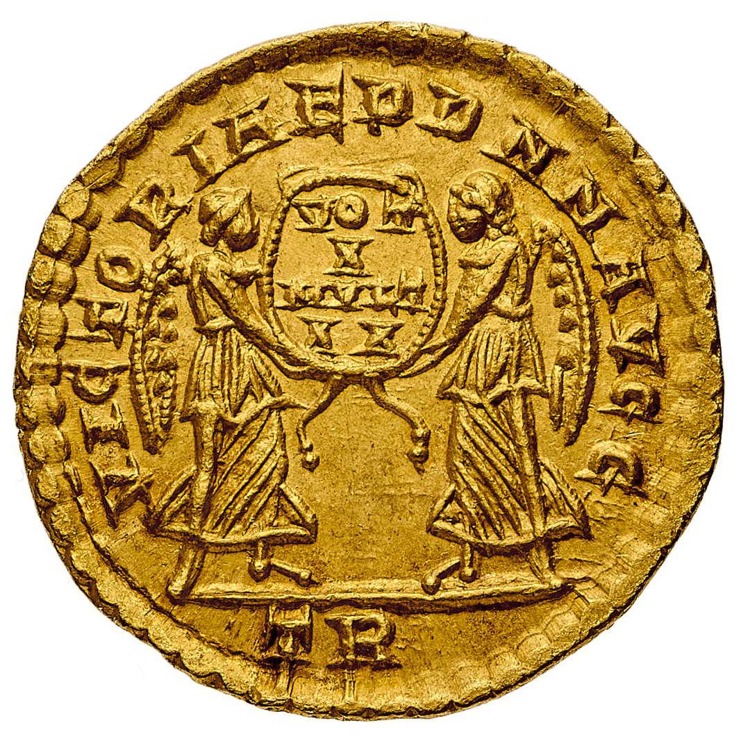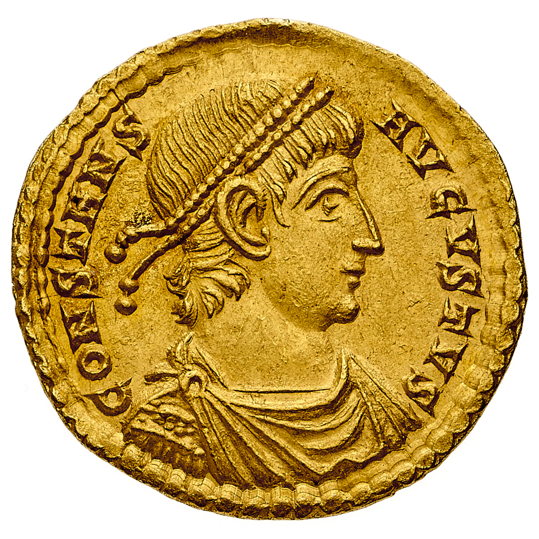 Solido databile agli anni 347-348 d.C. - Zecca: Treviri - Diritto: busto diademato di perle, drappeggiato e corazzato dell'Imperatore a destra - Rovescio: due Vittorie stanti di fronte tengono una corona fra esse, al cui interno campeggia la legenda - gr. 4,37 - Rara - Migliore di SPL