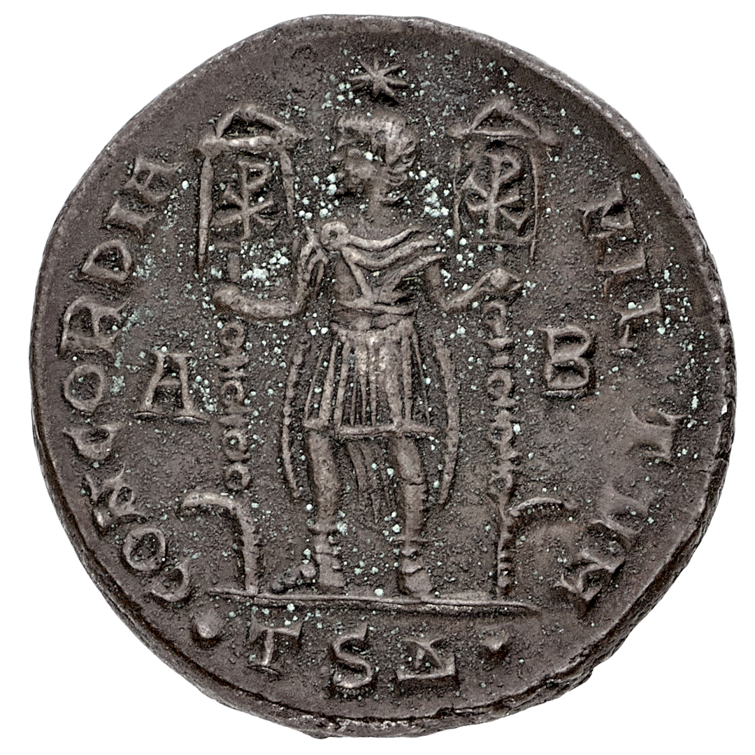 Maiorina - Zecca: Tessalonica - Diritto: busto laureato, drappeggiato e corazzato dell'Imperatore a destra - Rovescio: l'Imperatore, in abito militare e una stella sopra il capo, stante fra due insegne con il monogramma di Cristo, che tiene con ciascuna mano - gr. 4,92 - Rara - Migliore di BB