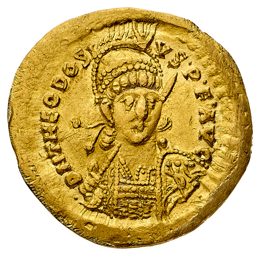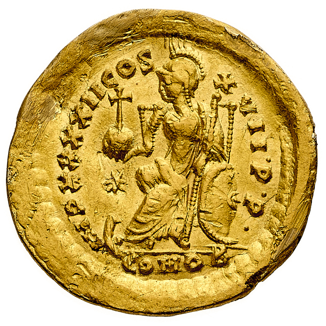 Solido databile al periodo 441-450 d.C. - Zecca: Costantinopoli - Diritto: mezzo busto elmato e diademato dell'Imperatore di fronte - Rovescio: Costantinopoli seduta in trono a sinistra tiene un globo crucigero con la mano destra e uno scettro con la sinistra; nel campo a sinistra una stella - gr. 4,42 - Probabili tracce di montatura, altrimenti migliore di BB