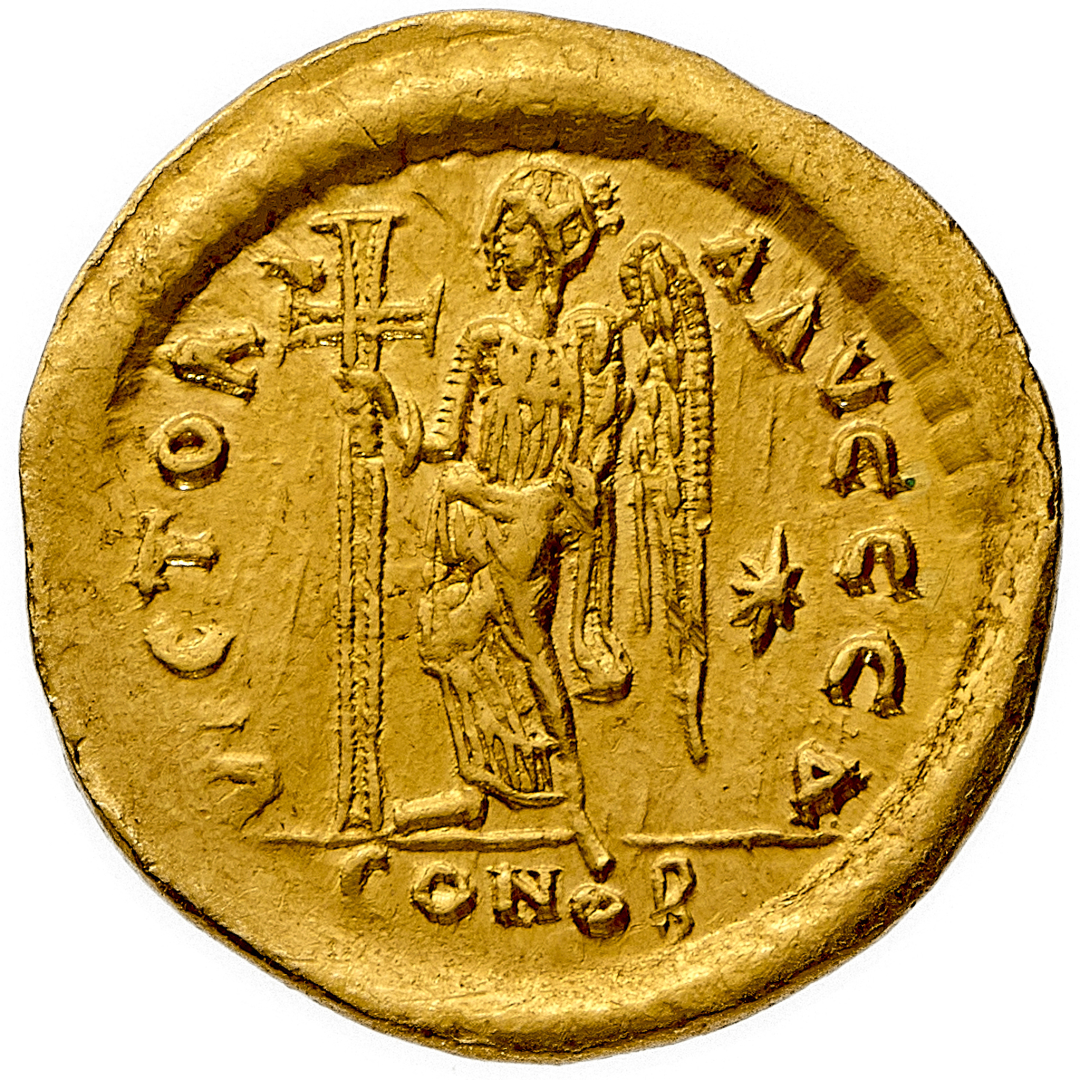 Anastasio (491-518) - Solido databile al periodo 491-498 - Zecca: Costantinopoli - Diritto: mezzo busto elmato e diademato dell'Imperatore di fronte - Rovescio: la Vittoria stante a sinistra tiene con la mano destra una lunga croce ingioiellata; nel campo a destra una stella - gr. 4,48 - Lieve difetto al diritto, SPL