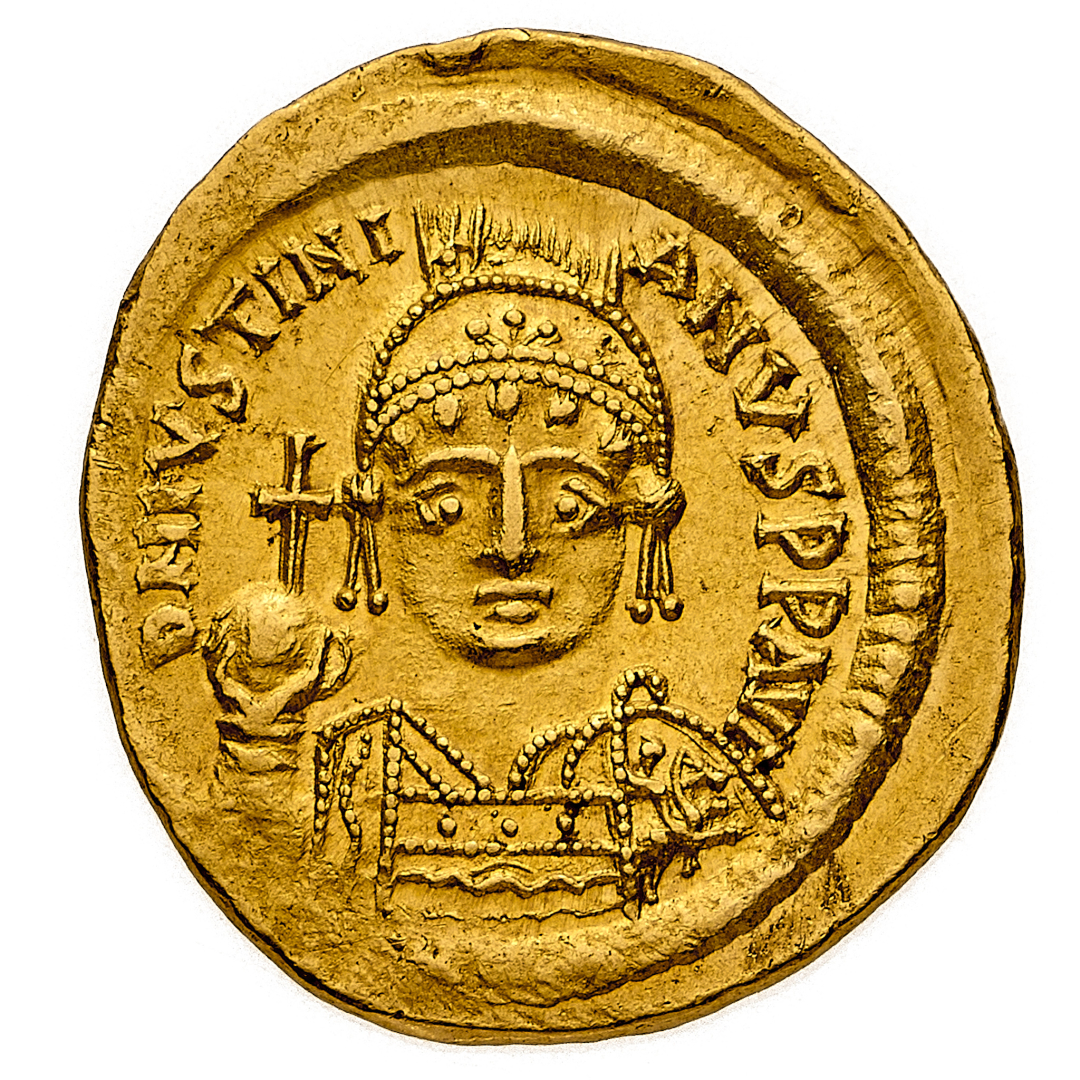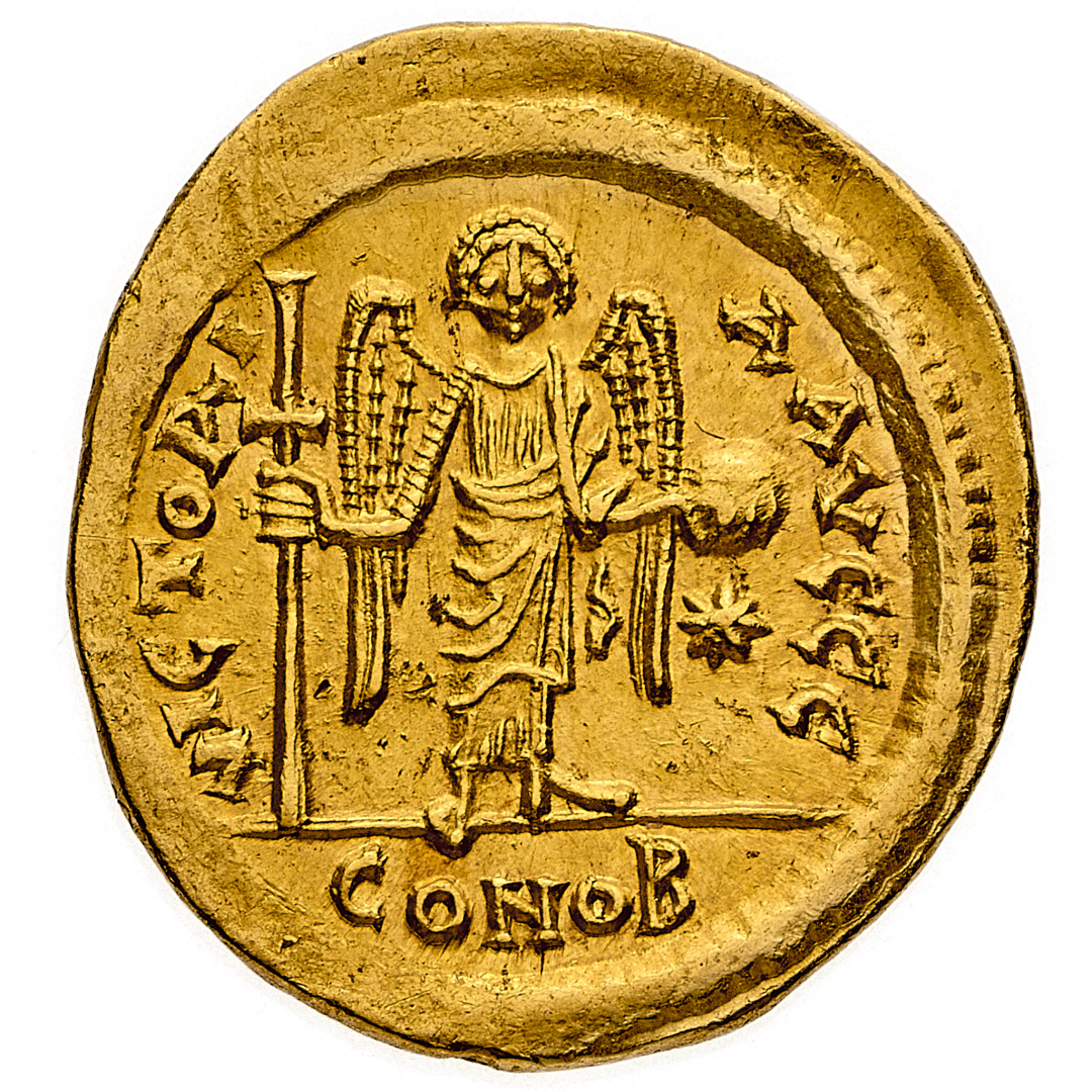 Giustiniano I (527-565) - Solido databile al periodo 542-552 - Zecca: Tessalonica - Diritto: mezzo busto elmato e diademato dell'Imperatore di fronte con globo crucigero nella mano destra e scudo nella sinistra - Rovescio: un angelo stante di fronte tiene una lunga croce con la mano destra e un globo con la sinistra; nel campo a destra una stella - gr. 4,43 - Rara - Migliore di SPL