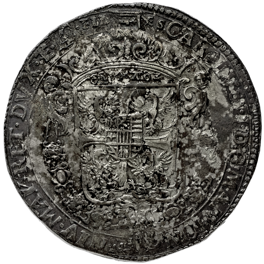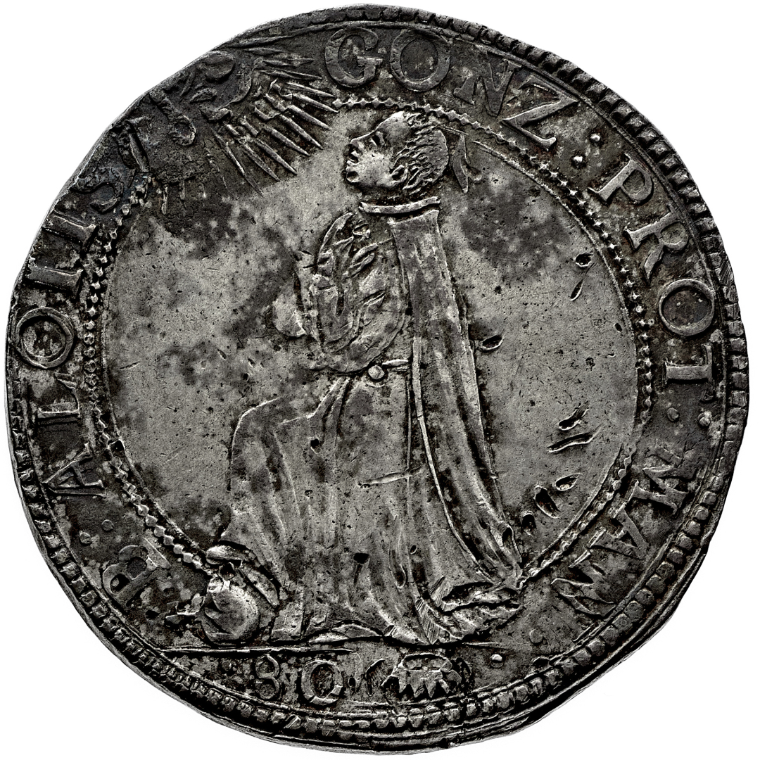 Carlo I Gonzaga (1627-1637) - Mezzo Ducato da 80 Soldi - Diritto: stemma coronato circondato da un collare - Rovescio: San Luigi Gonzaga genuflesso a sinistra - gr. 14,71 - Rara - Lievi colpetti al diritto, q.SPL
