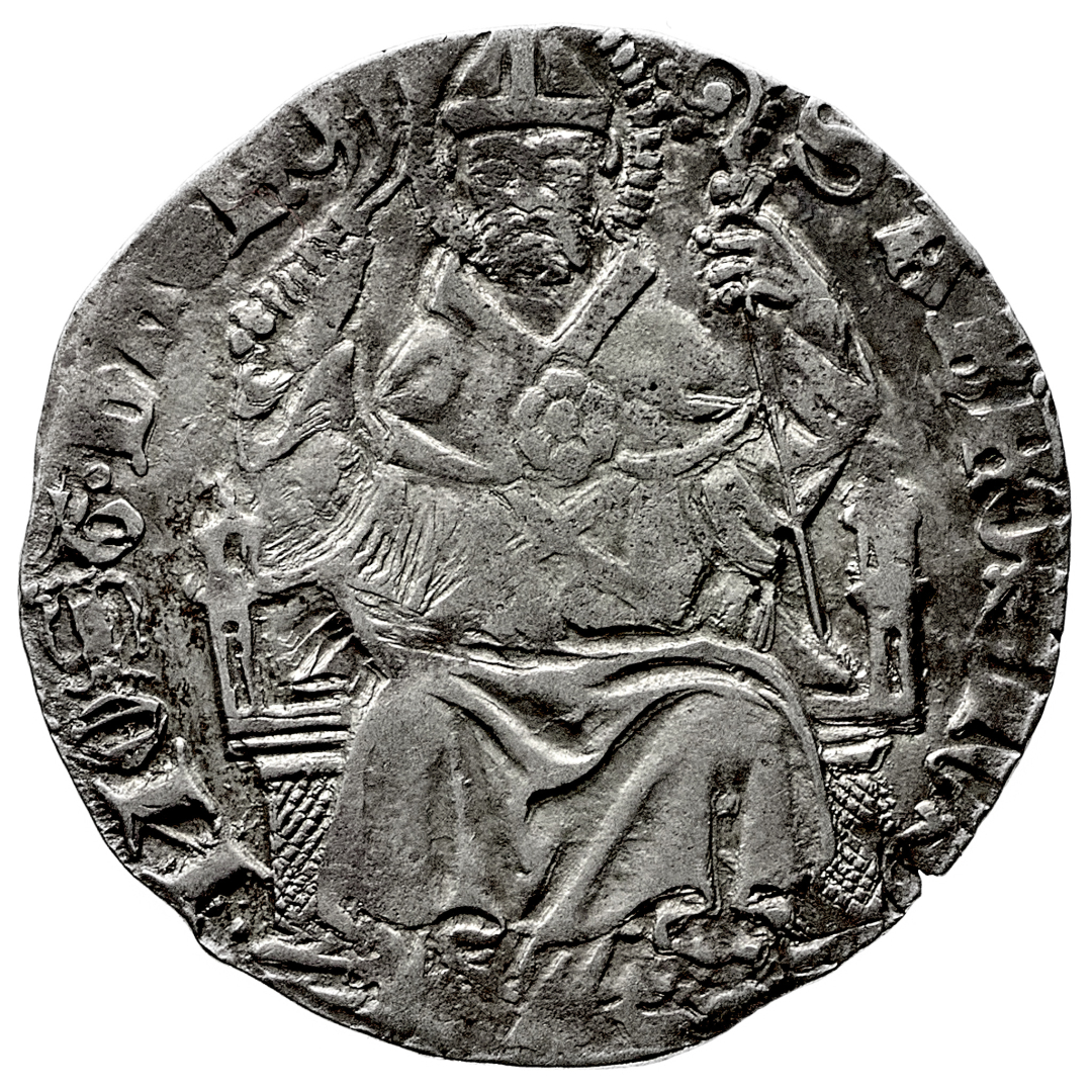Estore Visconti (1407-1413) - Grosso - Diritto: Sant'Ambrogio seduto di fronte tiene uno staffile con la mano destra e il pastorale con la sinistra - Rovescio: il biscione visconteo con il fanciullo nelle fauci - gr. 2,30 - Molto rara - BB
