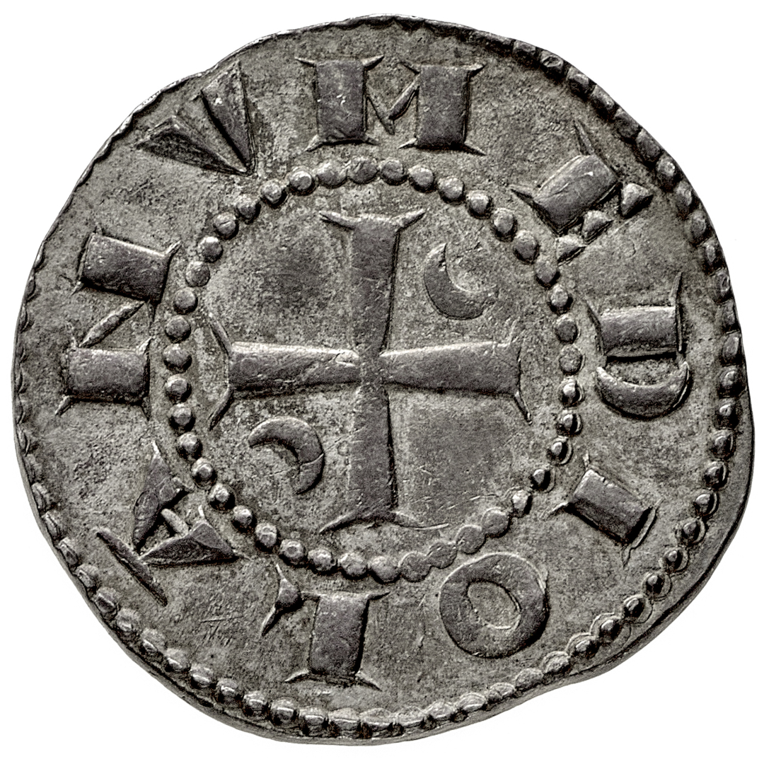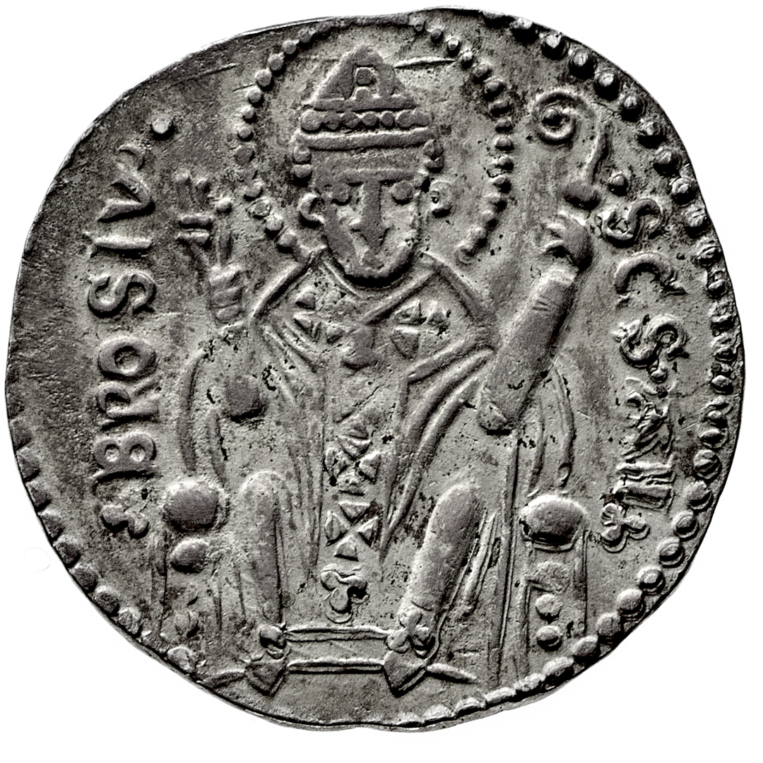 Prima Repubblica (1250-1310) - Ambrosino - Diritto: croce patente accantonata da due mezze lune - Rovescio: Sant'Ambrogio mitrato e nimbato, seduto di fronte, benedice con la mano destra e regge il pastorale con la sinistra - gr. 2,92 - Rara - q.SPL