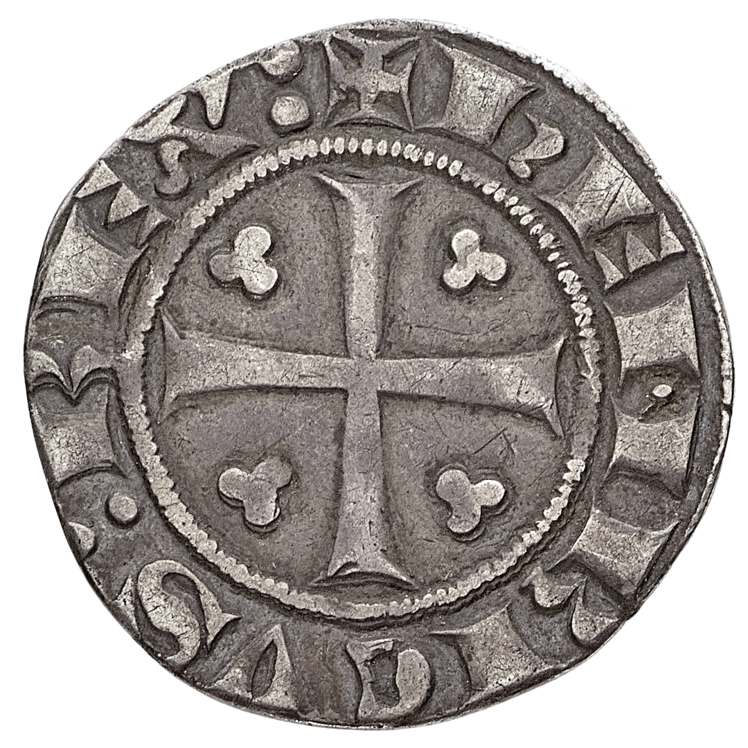 Enrico VII di Lussemburgo, Imperatore e Re d'Italia (1310-1331) - Doppio Ambrosino o Grosso - Diritto: croce accantonata da quattro trifogli - Rovescio: Sant'Ambrogio mitrato e nimbato, seduto di fronte, benedice con la mano destra e regge il pastorale con la sinistra - gr. 3,47 - Rara - BB - Corredata dal cartellino di Oscar Rinaldi