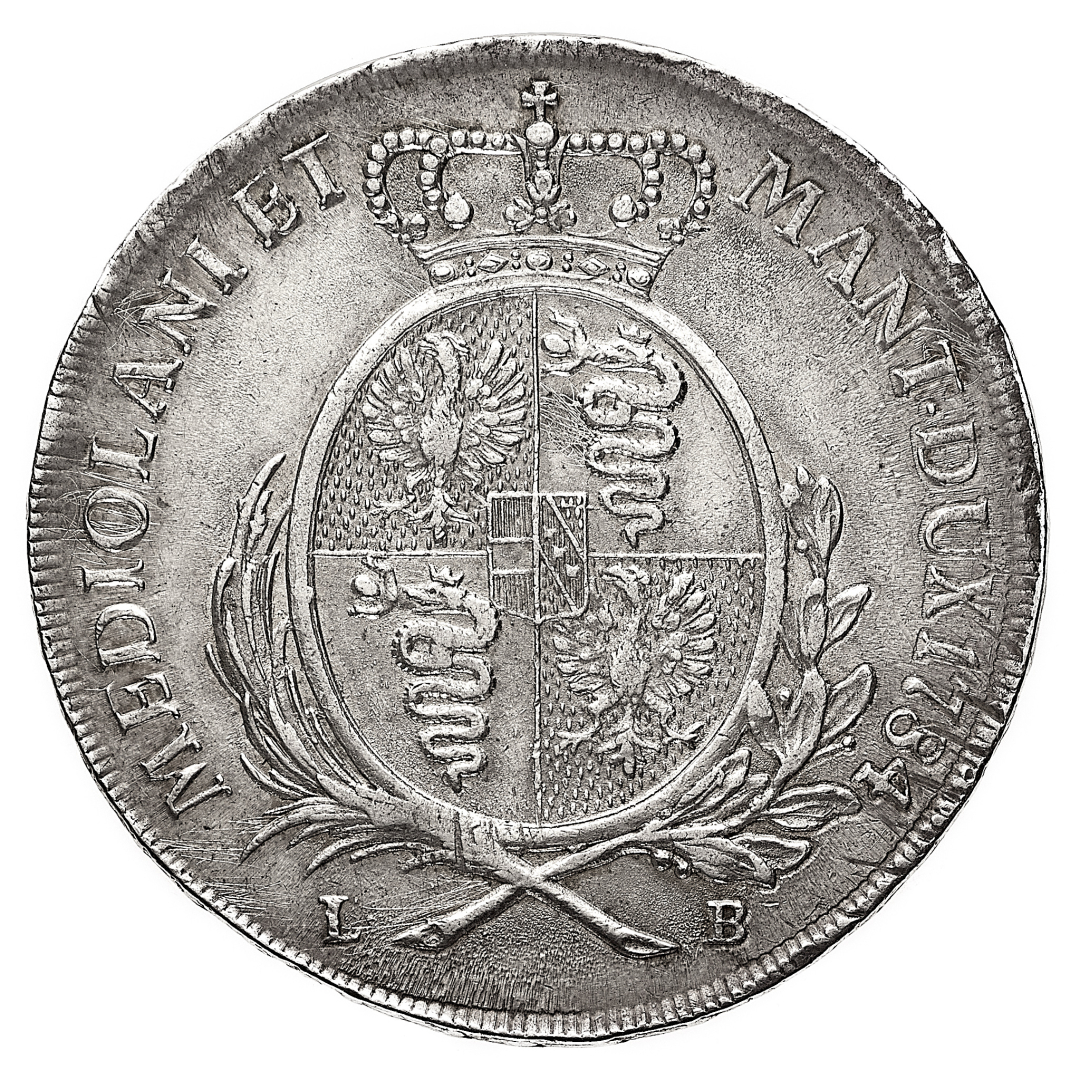 Giuseppe II d'Asburgo (1780-1790) - Scudo 1784 - Diritto: effigie laureata di Giuseppe II a destra - Rovescio: stemma coronato d'Austria e di Milano entro rami di alloro e di palma - gr. 23,05 - Non comune - Migliore di BB