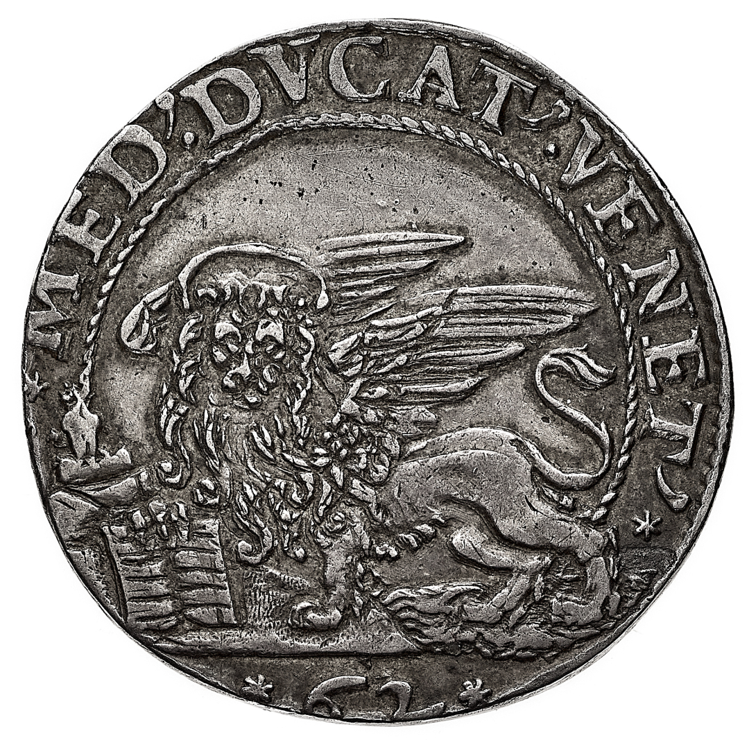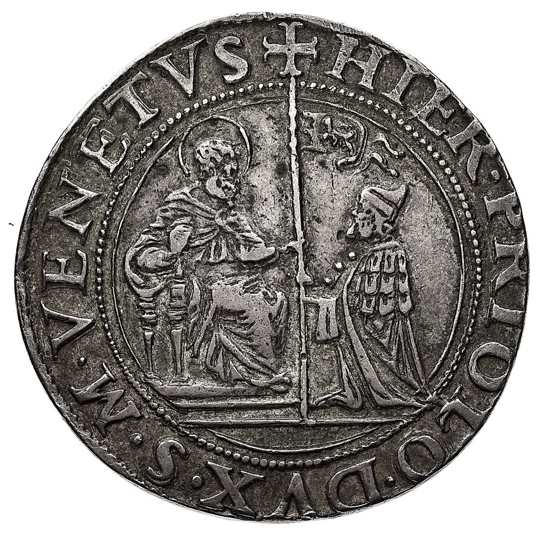 Girolamo Priuli (1559-1567) - Mezzo Ducato da 62 Soldi - Zecca: Venezia - Diritto: il Doge genuflesso riceve da San Marco seduto la benedizione e il vessillo della Repubblica - Rovescio: il leone di San Marco a sinistra con la testa di fronte mostra il Vangelo aperto - gr. 14,75 - Molto rara - Patina di medagliere, migliore di BB - Proveniente dall'asta NAC 20, Zurigo 2-3.11.2000, n. 1090