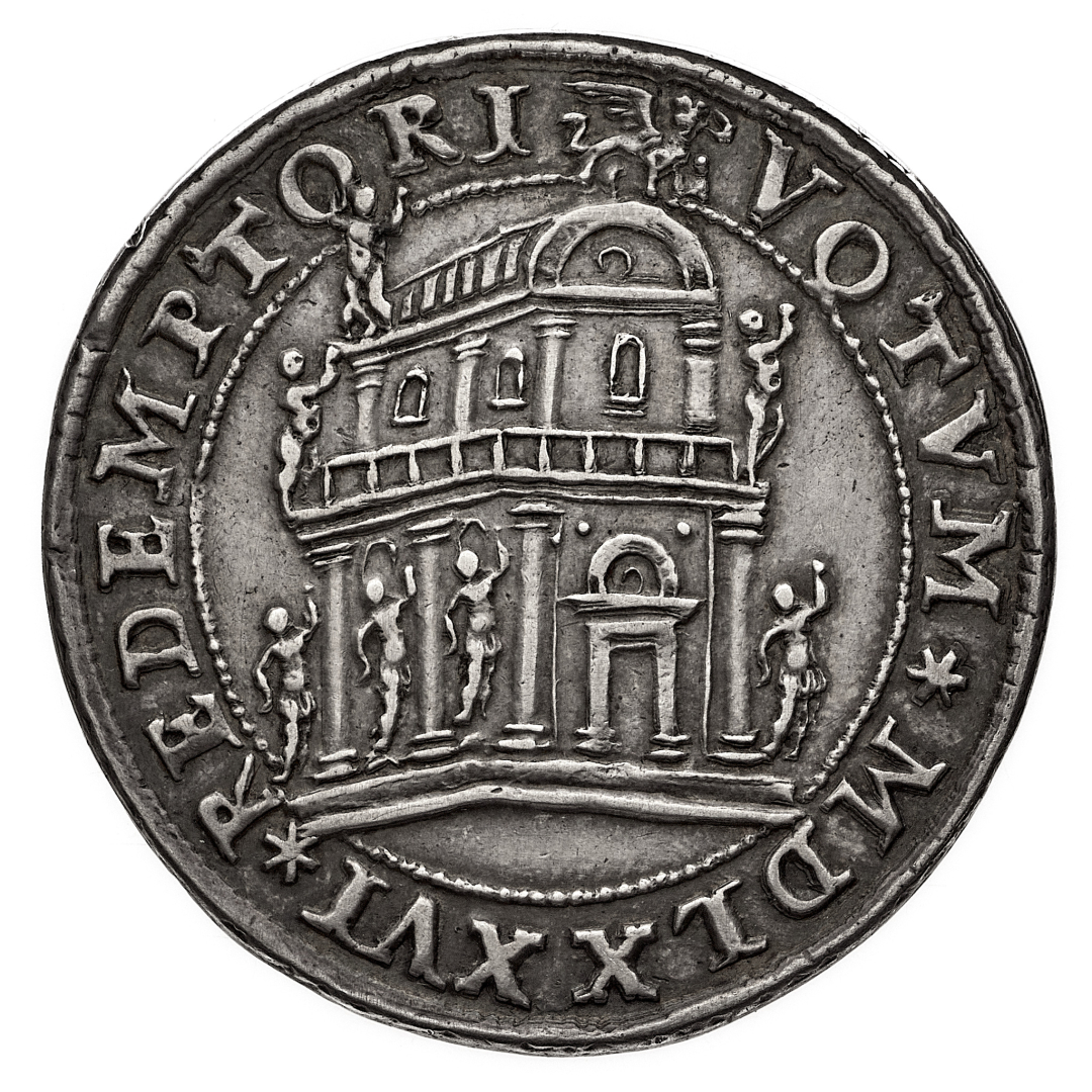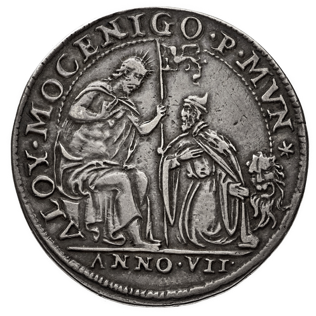 Alvise I Mocenigo (1570-1576) - Osella Anno VII (1576) - Zecca: Venezia - Diritto: il Doge genuflesso riceve da San Marco il vessillo della Repubblica - Rovescio: Chiesa del Redentore della Giudecca - gr. 9,62 - Rara - Patina di medagliere, q.SPL - Proveniente dall'asta NAC 43, Milano 26.11.2007, n. 174