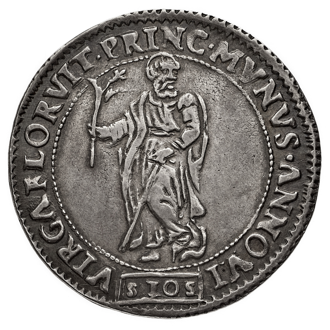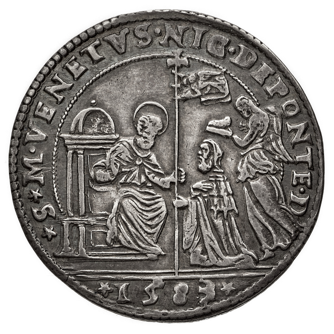 Nicolò da Ponte (1578-1585) - Osella Anno VI 1583 - Zecca: Venezia - Diritto: il Doge genuflesso riceve da San Marco il vessillo della Repubblica; sulla destra, dietro il Doge, un angelo gli impone il corno dogale - Rovescio: San Giuseppe stante di fronte tiene un ramo fiorito con la mano destra - gr. 9,72 - Rara - Patina iridescente, q.SPL