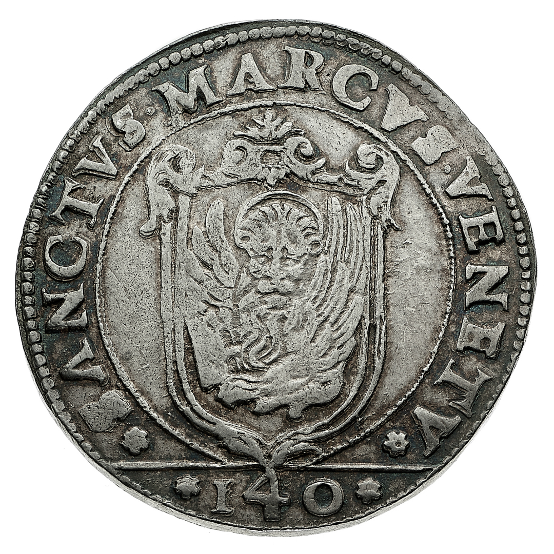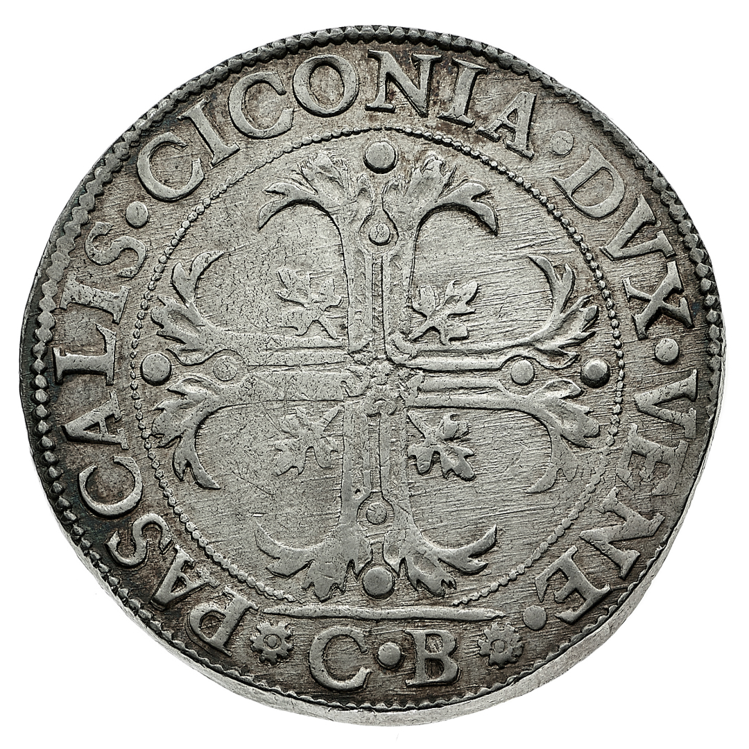 Pasquale Cicogna (1585-1595) - Scudo della Croce da 140 Soldi - Zecca: Venezia - Diritto: croce fogliata - Rovescio: leone di San Marco entro scudo ornato - gr. 31,85 - Sigle CB - Splendida patina, SPL