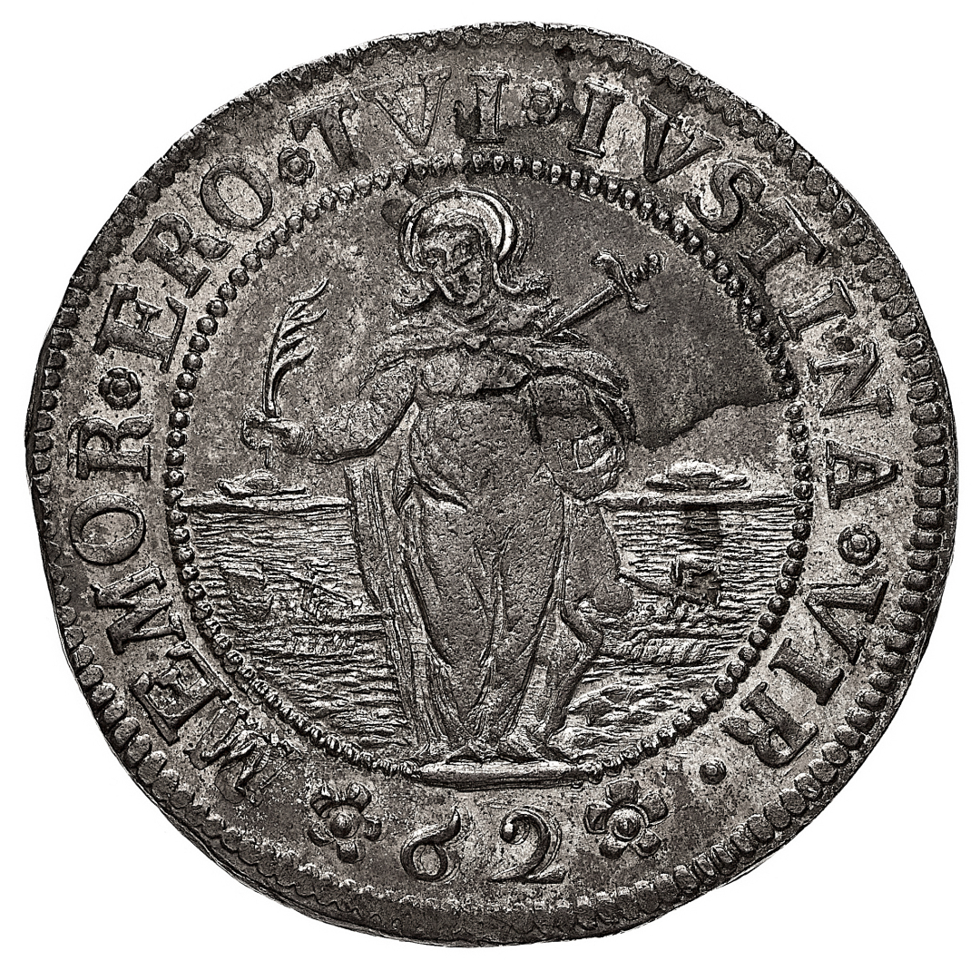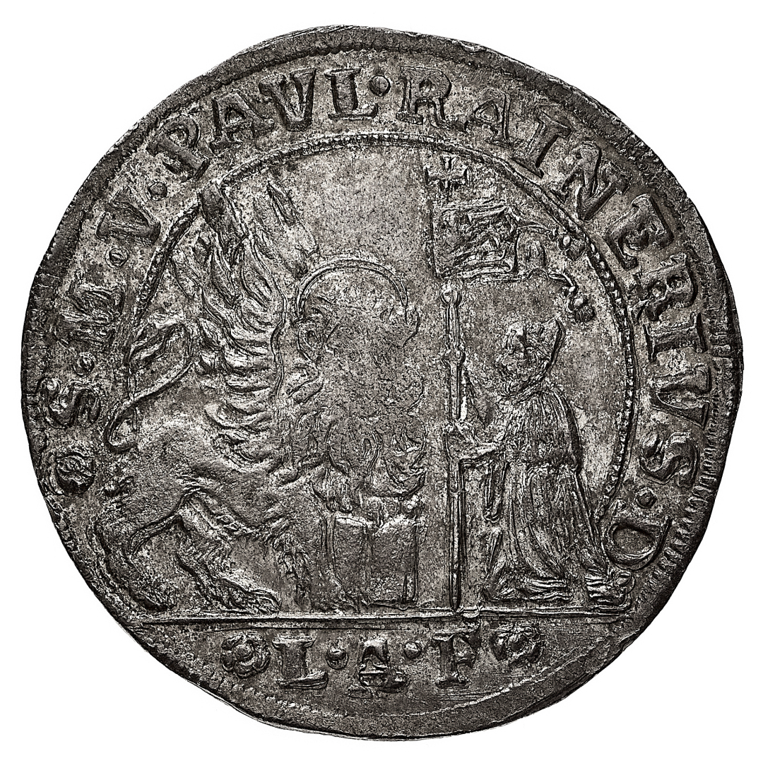 Paolo Renier (1779-1789) - Mezzo Ducato con Santa Giustina da 62 Soldi - Zecca: Venezia - Diritto: il Doge genuflesso verso sinistra stringe il vessillo della Repubblica di fronte al leone alato a destra - Rovescio: Santa Giustina stante in posizione frontale tiene con la mano destra un ramo di palma e con la sinistra un libro; ha il petto trafitto da un pugnale; sullo sfondo il mare agitato con due galere - gr. 13,94 - Sigle LAF - Molto rara - Metallo ancora lucente, q.SPL - Proveniente dall'asta NAC 20, Zurigo 2-3.11.2000, n. 1382