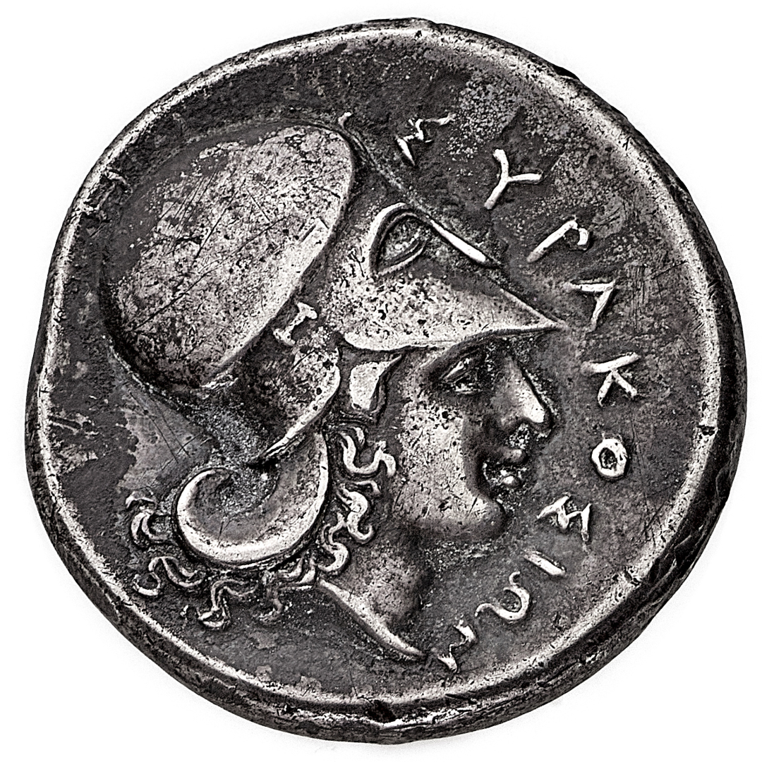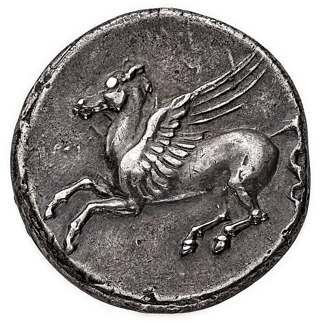 Siracusa - Statere databile al periodo 344-335 a.C. - Diritto: Pegaso in volo verso sinistra - Rovescio: testa di Atena con elmo corinzio a destra - gr. 8,58 - Patina gradevole, migliore di BB