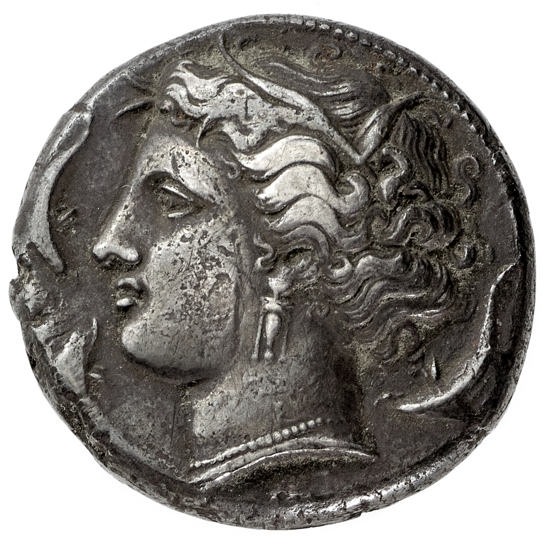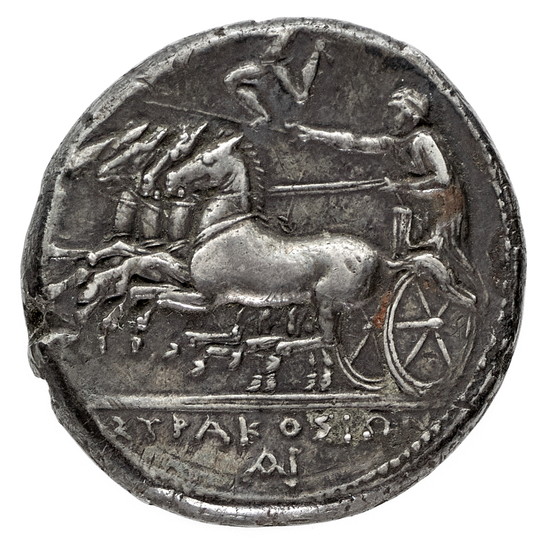Siracusa - Periodo di Agatocle (317-289 a.C.) - Tetradramma databile al periodo 310-305 a.C. - Diritto: testa di Aretusa a sinistra; attorno quattro delfini e sotto il collo il monogramma NI - Rovescio: quadriga al galoppo verso sinistra; in alto, nel campo, una triscele - gr. 16,95 - Rara - Lievi depositi al rovescio, altrimenti migliore di BB