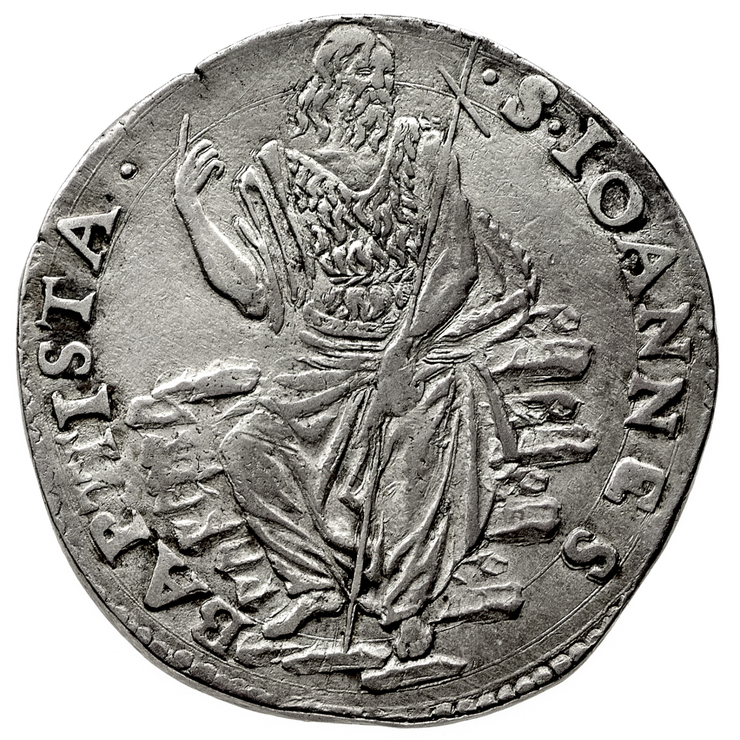 Cosimo I de' Medici Duca di Firenze e Siena (1555-1569) - Testone - Zecca: Firenze - Diritto: busto del Duca a destra - Rovescio: San Giovanni seduto di fronte alza la mano destra nell'atto di predicare - gr. 9,21 - Rara - q.SPL