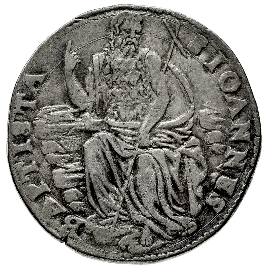 Cosimo I de' Medici Duca di Firenze e Siena (1555-1569) - Testone - Zecca: Firenze - Diritto: busto del Duca a destra - Rovescio: San Giovanni seduto di fronte alza la mano destra nell'atto di predicare - gr. 9,18 - BB - Corredata dal cartellino di Oscar Rinaldi