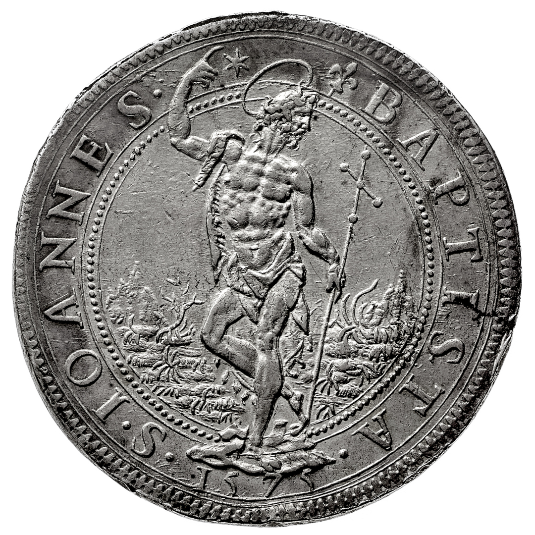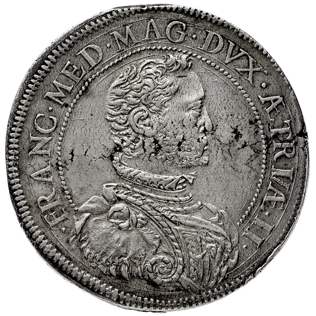 Francesco I de' Medici (1574-1587) - Piastra 1575 - Zecca: Firenze - Diritto: busto drappeggiato e corazzato del Granduca a destra - Rovescio: San Giovanni Battista stante di fronte con la testa rivolta a destra, alza la mano destra benedicente e tiene una lunga croce con la sinistra - gr. 32,29 - Rara - Lievi difetti di conio, altrimenti migliore di SPL