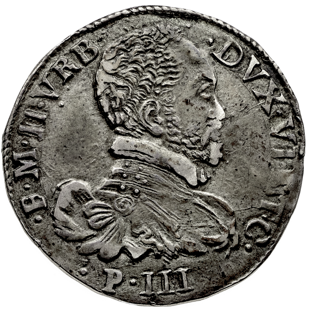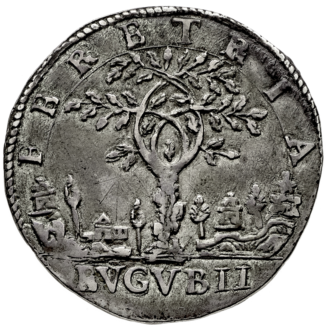 Francesco Maria II della Rovere (1574-1624) - Testone - Diritto: busto corazzato del Duca a destra - Rovescio: albero di rovere con i rami intrecciati, sullo sfondo di una veduta paesaggistica del Montefeltro; in esergo EVGVBII - gr. 9,52 - Molto rara - Lievi graffi al rovescio, altrimenti q.SPL