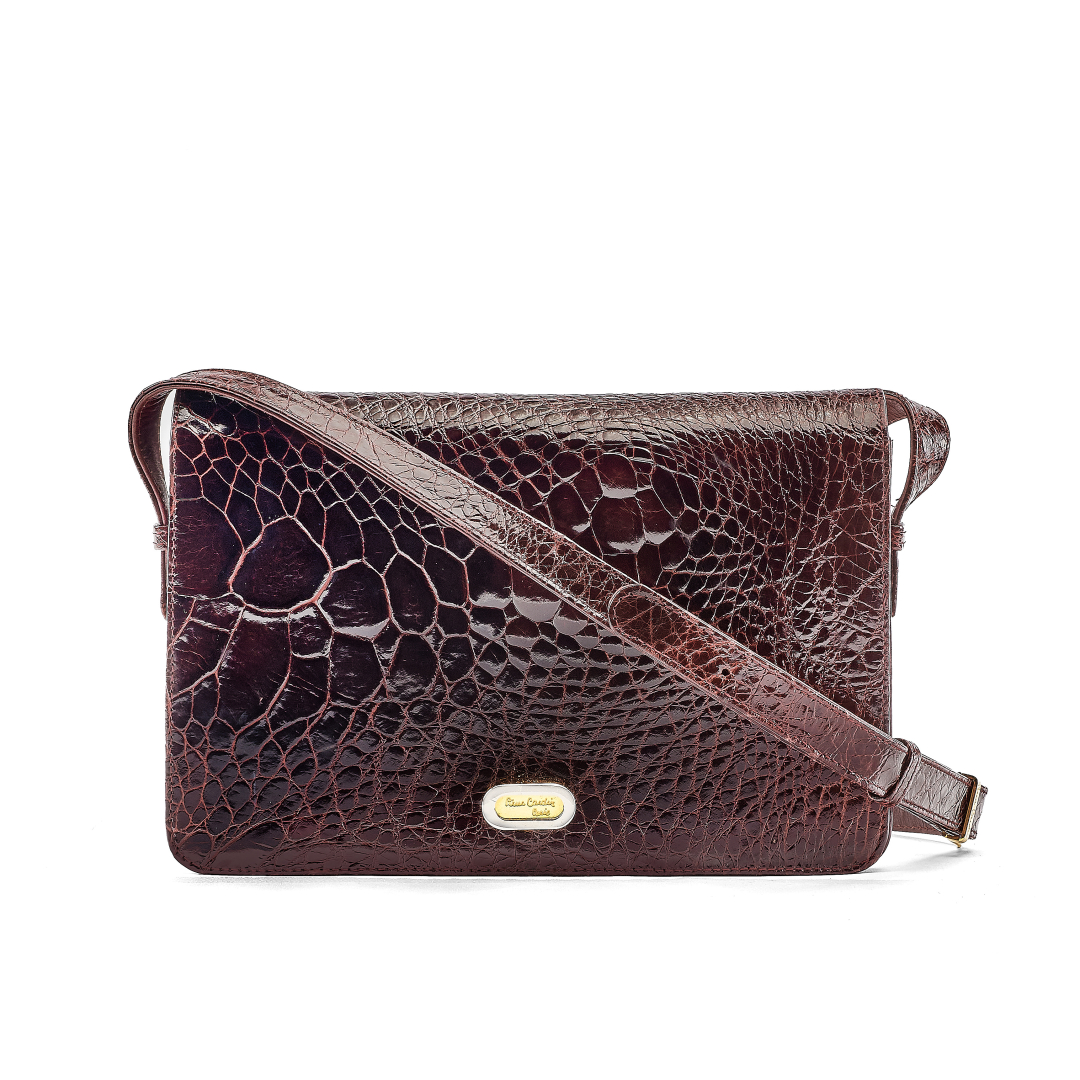 in coccodrillo bordeaux, interno in pelle bordeaux. Tracolla regolabile in pelle e coccodrillo. Chiusura con patta a pressione fermata da girello logato. Hardware in metallo argentato e dorato.
