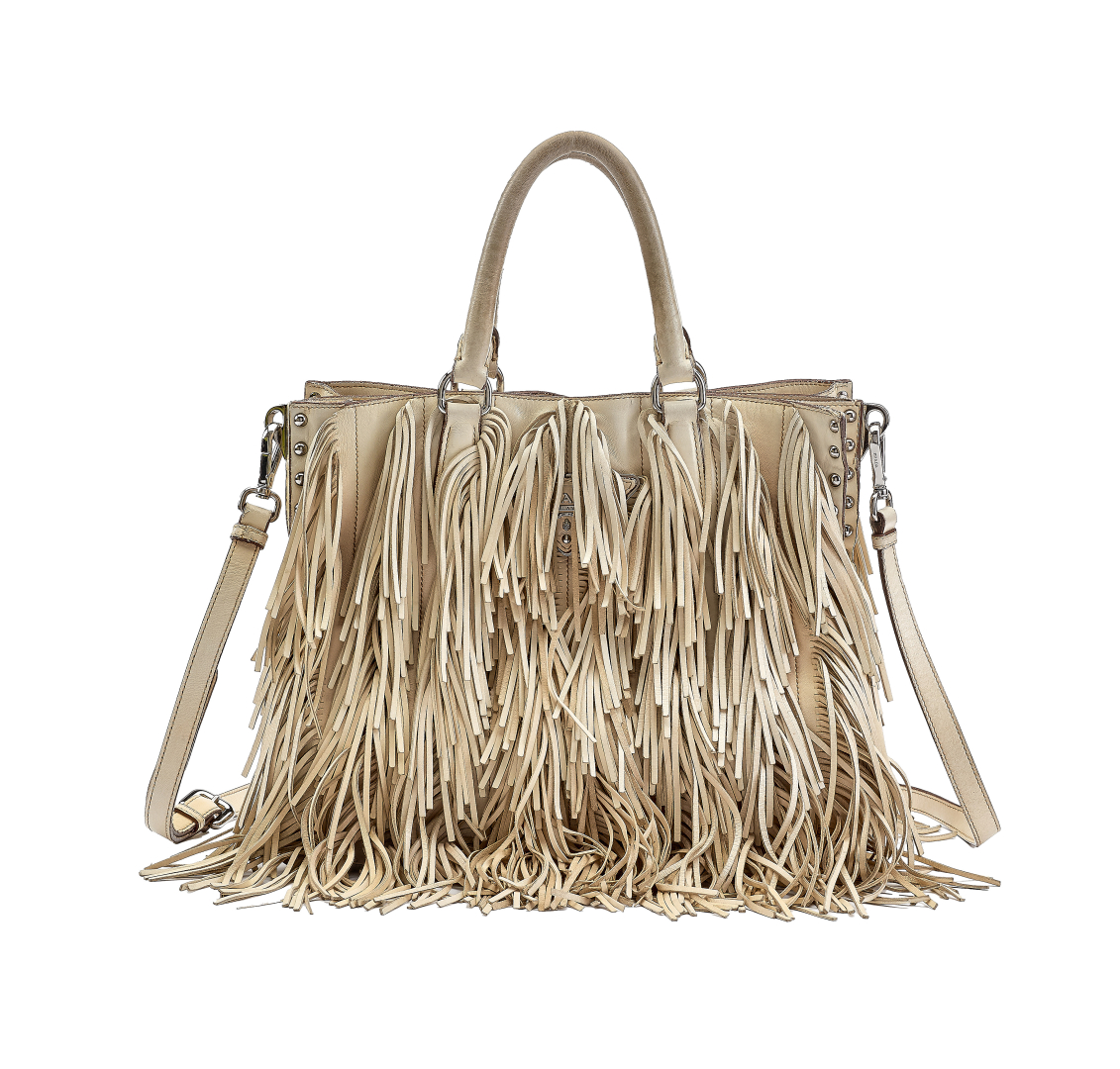 in nappa cera e borchie metalliche, interno in tessuto logato beige. Doppio manico, tracolla amovibile e regolabile in pelle. Doppio scomparto chiuso da magnete. Tutta la borsa è ricoperta da frange che nascondono il logo frontale. Hardware in metallo argentato.