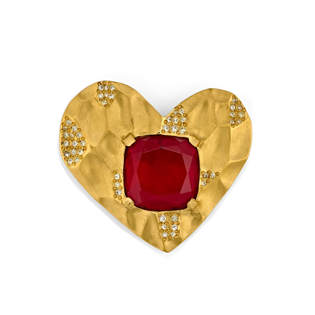 in metallo dorato, cristalli trasparenti e resina rossa. Il doppio attacco può trasformare la spilla in pendente.