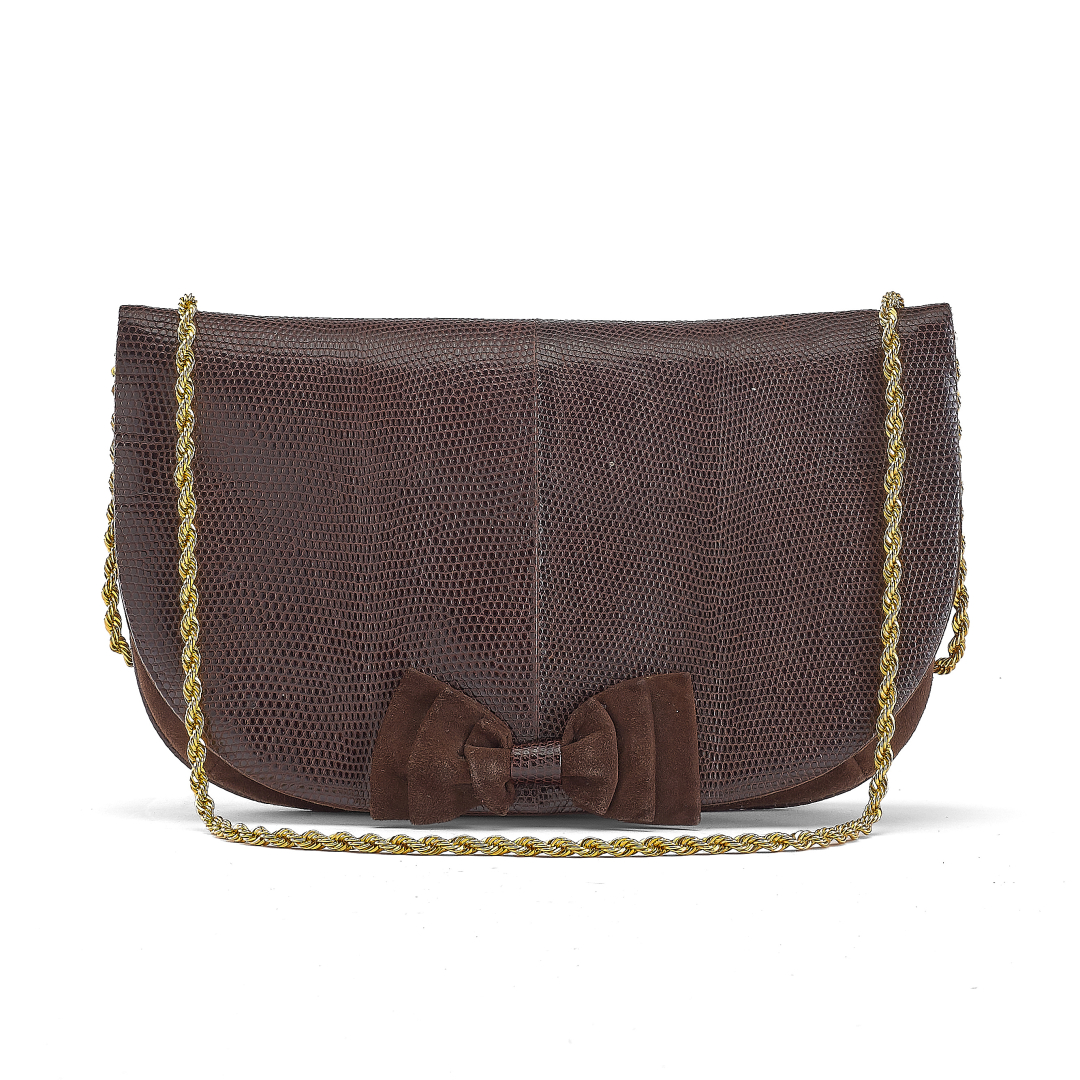 in camoscio e Lizard marrone, interno in nappa marrone. Tracolla a catena a spirale amovibile e trasformabile in cintura. Chiusura con patta e fiocco frontale, fermata da magnete. Hardware in metallo dorato.