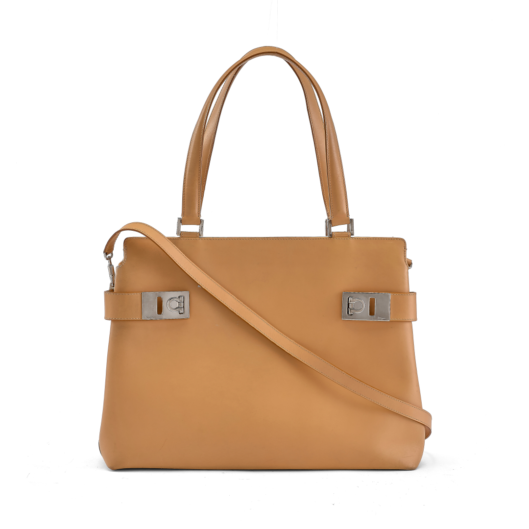 in pelle beige, interno in tessuto logato nero. Doppio manico e tracolla amovibile in pelle beige. Chiusura con zip e lacci regolabili fermati da iconici gancini a pressione. Hardware in metallo argentato.