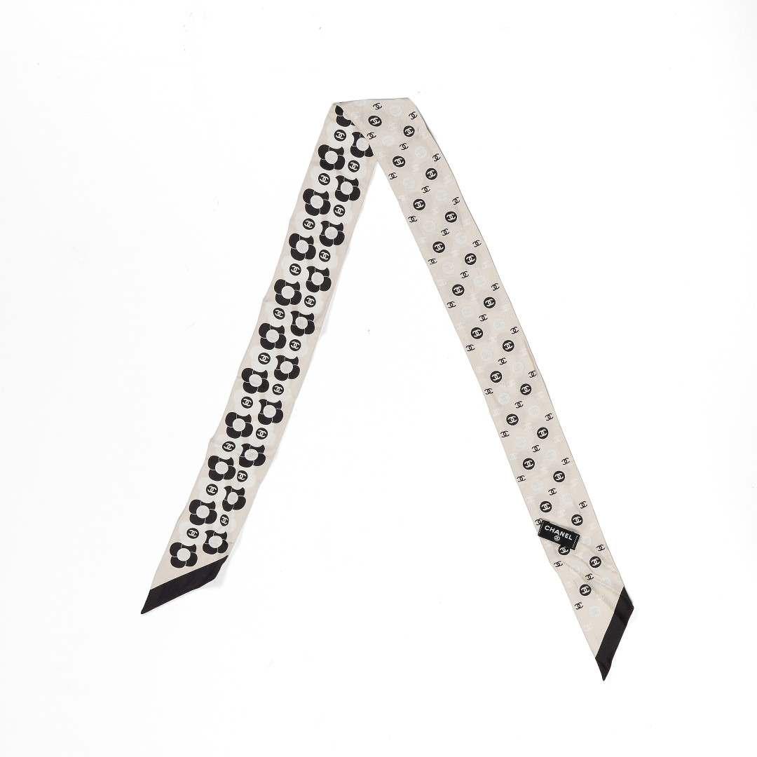 in twill di seta cipria, bianco e nero. Il logo CC e il disegno dell'iconica camelia stilizzata sono ripetuti all'infinito sulla superficie.