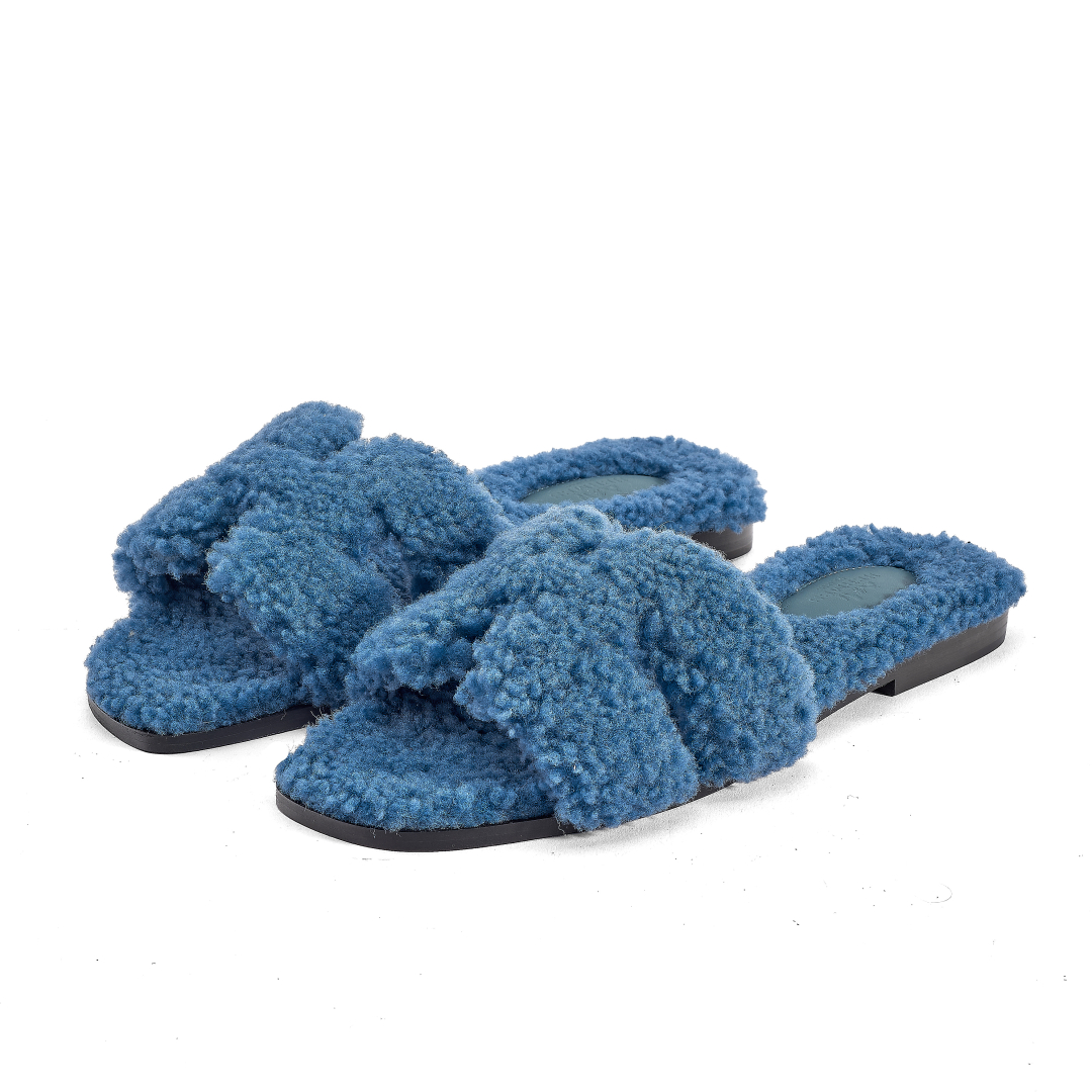 in shearling carta da zucchero con iconico taglio a "H". Suola in cuoio grigio, tacco in pelle nera. Soletta e fodera in shearling.