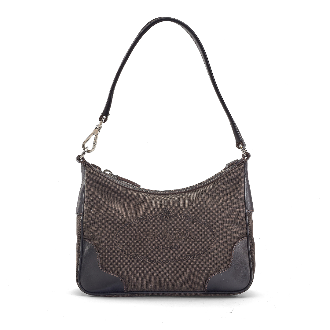 in tela jaquard marrone con dettagli di pelle in tinta. Interno in tessuto marrone logato. Manico amovibile che permette di portare la borsa al polso. Chiusura con zip. Hardware in metallo argentato.