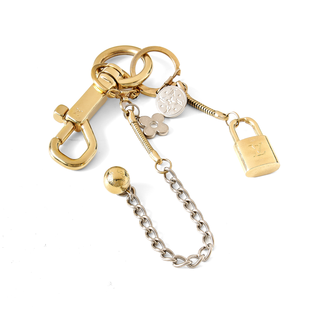 in metallo dorato e argentato. Un moschettone con logo fa da base a due anelli portachiavi con iconici ciondoli logati.