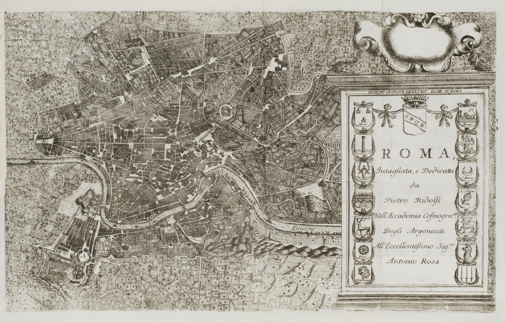In 4° oblungo (195 x 272 mm); 16 parti in 1 volume. Lombardia: 6 carte, vedute e piante di cui 1 mappa geografica ripiegata più volte e 1 carta di testo come da Indice; Piemonte: 21 carte, vedute e piante e 2 carte di testo con la Pianta di Vercelli due volte (manca Pinarollo città in pianta); Savoja: 12 carte, vedute e piante come da Indice; Provenza: 5 carte, vedute e piante come da Indice più il Contado di Nizza non elencato; Milanese: 40 carte, vedute e piante e 2 carte di testo con lo Stato di Milano non indicato nell'Indice ma mancante del Castello d'Alessandria; Mantova: Ritratto del duca di Mantova ripiegato e 7 carte, vedute e piante, 1 carta di testo come da Indice; Monferrato: 6 vedute e 1 carta di testo come da Indice; Parmegiano: Ritratto del Duca di Parma ripiegato e 7 carte, vedute e piante come da Indice; Modena: 6 carte, vedute e piante come da Indice; Stato Ecclesiastico: 2 occhietti, e 37 carte, vedute e piante, in parte ripiegate; Umbria: Occhietto, e 33 vedute e piante, in parte ripiegate; Marche: Occhietto, 1 ritratto e 3 vedute e piante; Urbino: Occhietto e 25 carte, vedute e piante, in parte ripiegate; Regno di Napoli: 62 carte, vedute e piante, in parte ripiegate, e 1 carta di testo con due vedute di più rispetto all'Indice ma mancante di Posilippo, Veduta di Pozzuoli, Castelio, Castell'à Mare di Stabbia e delle Isole di Tremiti; Sicilia e Malta: 22 carte, vedute e piante, in parte ripiegate, e 2 carte di testo; rispetto all'Indice mancano il Ritratto del Gran Mastro di Malta e una Pianta di Malta più distinta ma ci sono due tavole di blasoni (piccoli difetti.) Legatura coeva in mezzo vitellino con titolo in oro su tassello al dorso, tagli a spruzzo rosso.