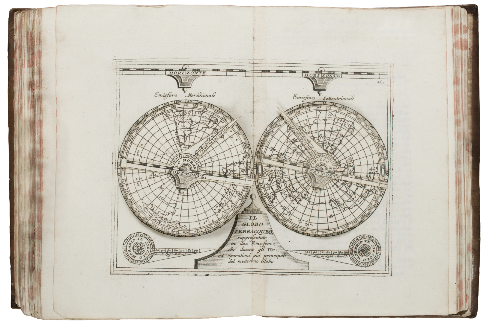 In 8° (188 x 133 mm); [28], 420, [16] pagine. Antiporta allegorica incisa, 37 tavole di cui 6 planisferi celesti e terrestri di forma circolare, più volte ripiegati, e una tavola con volvelle funzionanti (piccolo strappo alla piega di 3 carte ripiegate.) Legatura coeva in pelle a spruzzo con titolo manoscritto su tassello al dorso liscio, tagli marmorizzati.