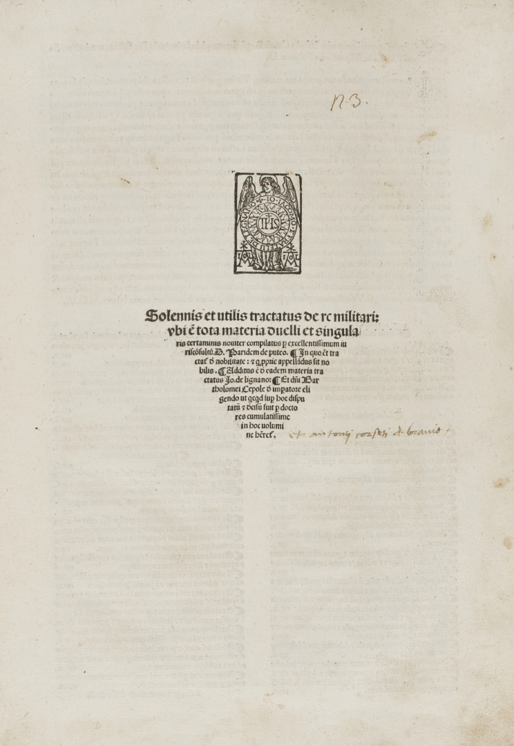 Esemplare freschissimo di questa terza edizione in assoluto e prima uscita dai torchi dei fratelli Da Legnano del testo che fu pubblicato per la prima volta nel 1476-77. Dal Paride considerava il duello parte integrante dei codici di comportamento cavallereschi, per i quali aveva bisogno di giustificare la legittimità della guerra stessa. La sua opera compare anche nell'opera di Castillo sul duello. L'esemplare contiene una curiosa nota di possesso del 1523 che indica che "altri libri prestati al medesimo signore mentre dimorava in paese per sospetto di peste, e che per tale motivo furono bruciati".