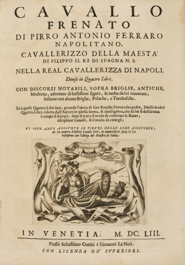 In 2° (319 x 224 mm); 2 parti in 1 volume; [2], 118, [2]; 256 pagine. Vignetta incisa al frontespizio della prima parte, marca tipografica sul frontespizio della seconda parte, numerosissime xilografie nel testo, in gran parte a piena pagina, raffiguranti prevalentemente tipi di morsi e briglie antichi e moderni (strappo alla carta M1; bruniture). Legatura coeva in piena pergamena con doppia bordura in oro, fleuron centrale e negli angoli ai piatti, fregi in oro al dorso, titolo manoscritto (cerniera interna allentata, mancanza al lato del piatto posteriore).