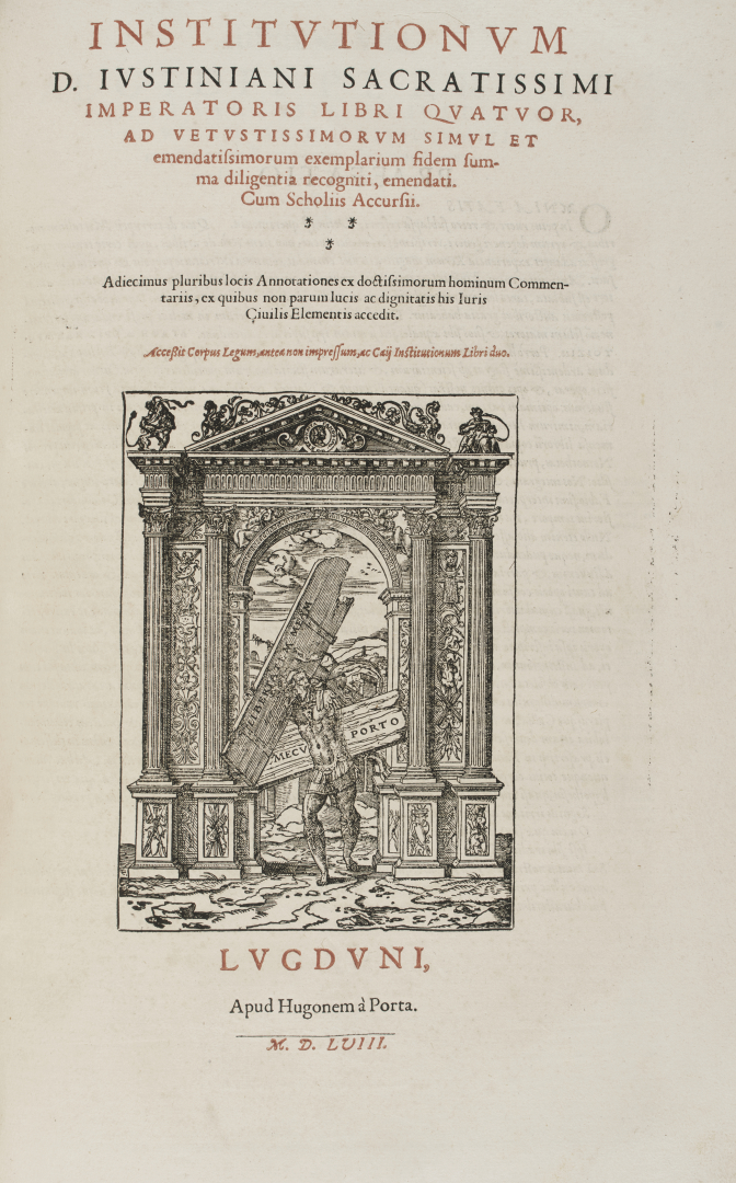 [Cinquecento]. Importante gruppo di opere del Cinquecento, di argomento giuridico e religioso, tra le quali risaltano la monumentale edizione Constitutiones Iustiniani ... Constitutiones Friderichi secundi imperatoris ... Extrauagantes duas Henrici septimi imperatoris et tractatum De pace Constantiae, curata da Andrea Alciati e uscita a Lione per i tipi di Hugues de La Porte nel 1558, in 2°, interamente stampata in rosso e nero, con numerose illustrazioni in xilografia; La Biblia sacra del 1581, in 8°, anch'essa in edizione lionese, con vignette xilografiche su disegno di Pierre Eskrich; La giuntina del 1546 Baptismale sive Cathecumenus, impressa in rosso e nero, con vignette xilografiche e notazione musicale delle preghiere, entro legatura in mezzo marocchino rosso, con titolo e data in oro al dorso; Testamenti Novi editio vulgata, edizione in piccolo formato di Girolamo Scoto del 1548, entro rilegatura coeva in pergamena, con titolo manoscritto al dorso.