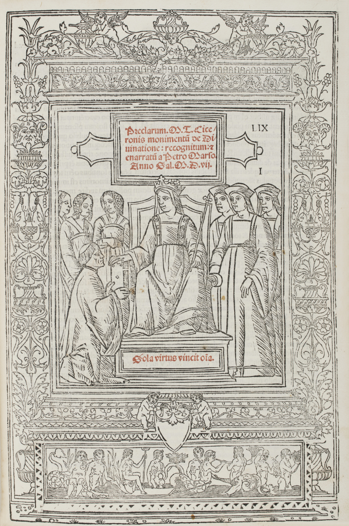 [Classici - Postincunabolo]. Cicerone. Illustria monimenta. M.T. Ciceronis De divina natura: & divinatione a Petro Marso reconcinnata. Venezia, Lazzaro Soardi, 1508.