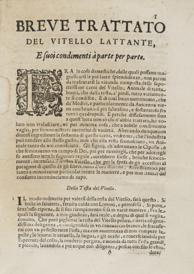 Prima e unica edizione. Celebre trattato sulla cultura culinaria del sec. XVII in cui si possono trovare numerose ricette, tra cui molte che oggi senza dubbio definiremmo di "cucina creativa", suggerimenti di impiattamento scenografico e descrizioni dettagliate di grandi cene e banchetti di nobili dell'epoca. Molto più di un semplice ricettario, l'Apicio di Giovanni Francesco Vasselli costituisce il "racconto di una vita trentennale da cortigiana, filtrato attraverso la descrizione dei banchetti offerti o frequentati da Alessandro I" (Longo-Michelassi, 2001, p. 36).