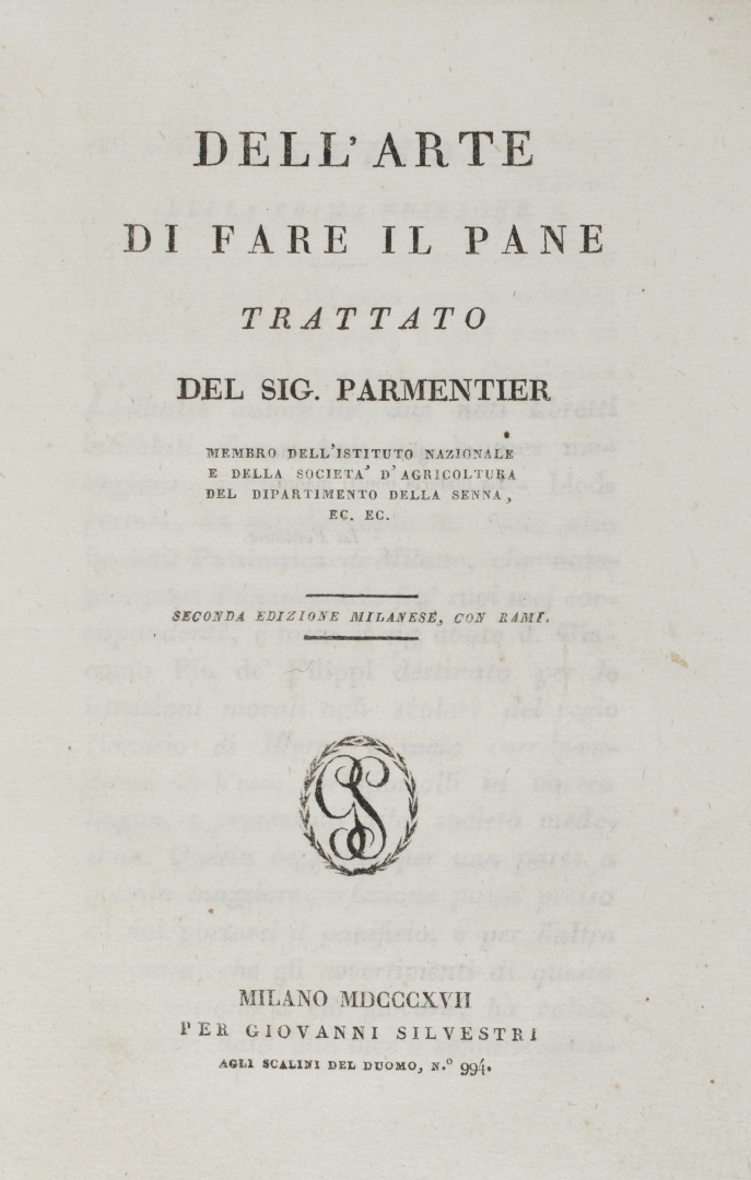 [Curiosa - Pane]. Curioso lotto dedicato alla panificazione: un esemplare con barbe Dell'arte di fare il pane trattato del sig. Parmentier nell'edizione milanese di Silvestri del 1817, entro brossura editoriale, il testo nell'edizione di napoli di Gaetano Nobili del 1854, sempre entro brossura editoriale a stampa, e il manuale Hoepli, Il pane e la panificazione di G. Ercolani del 1908.