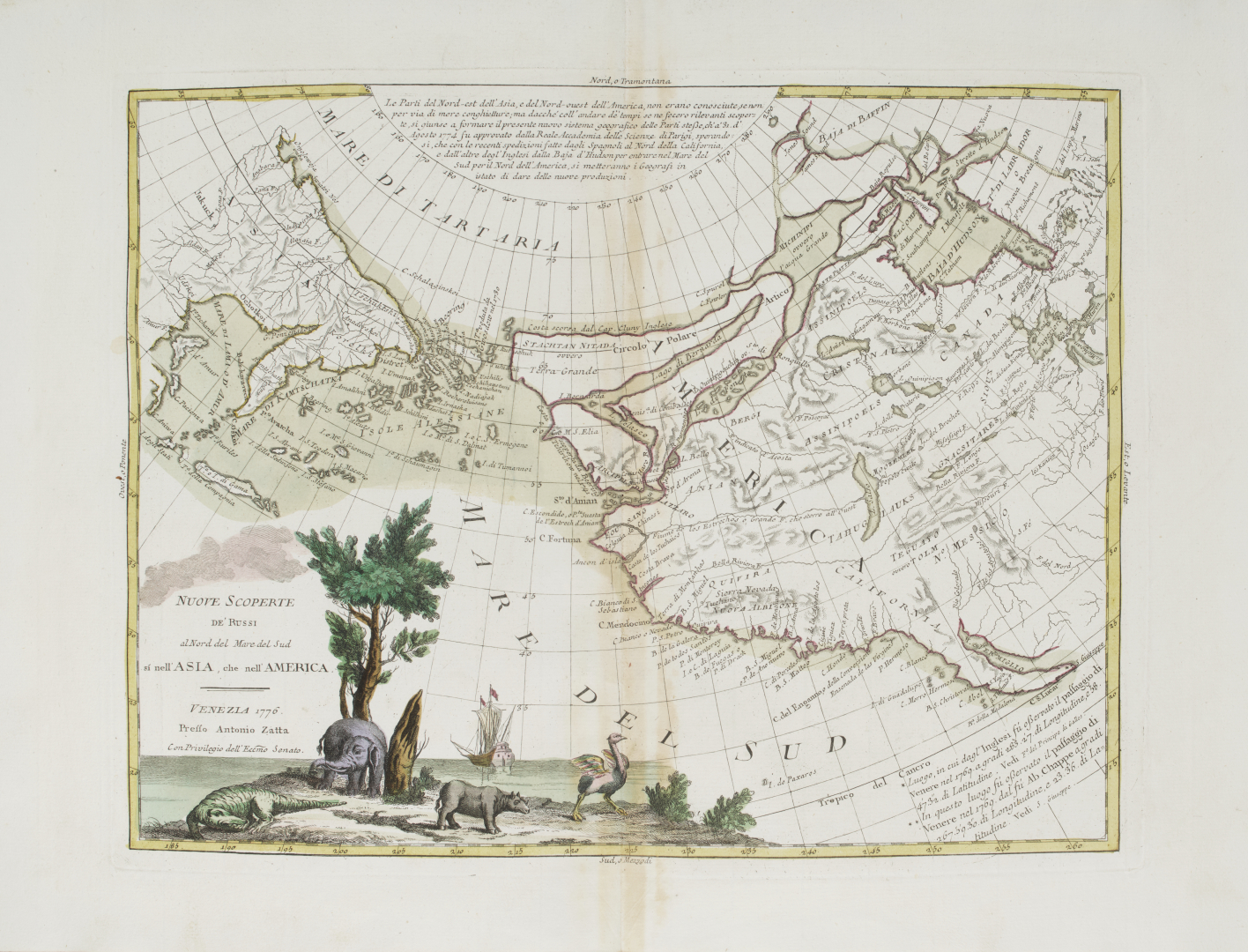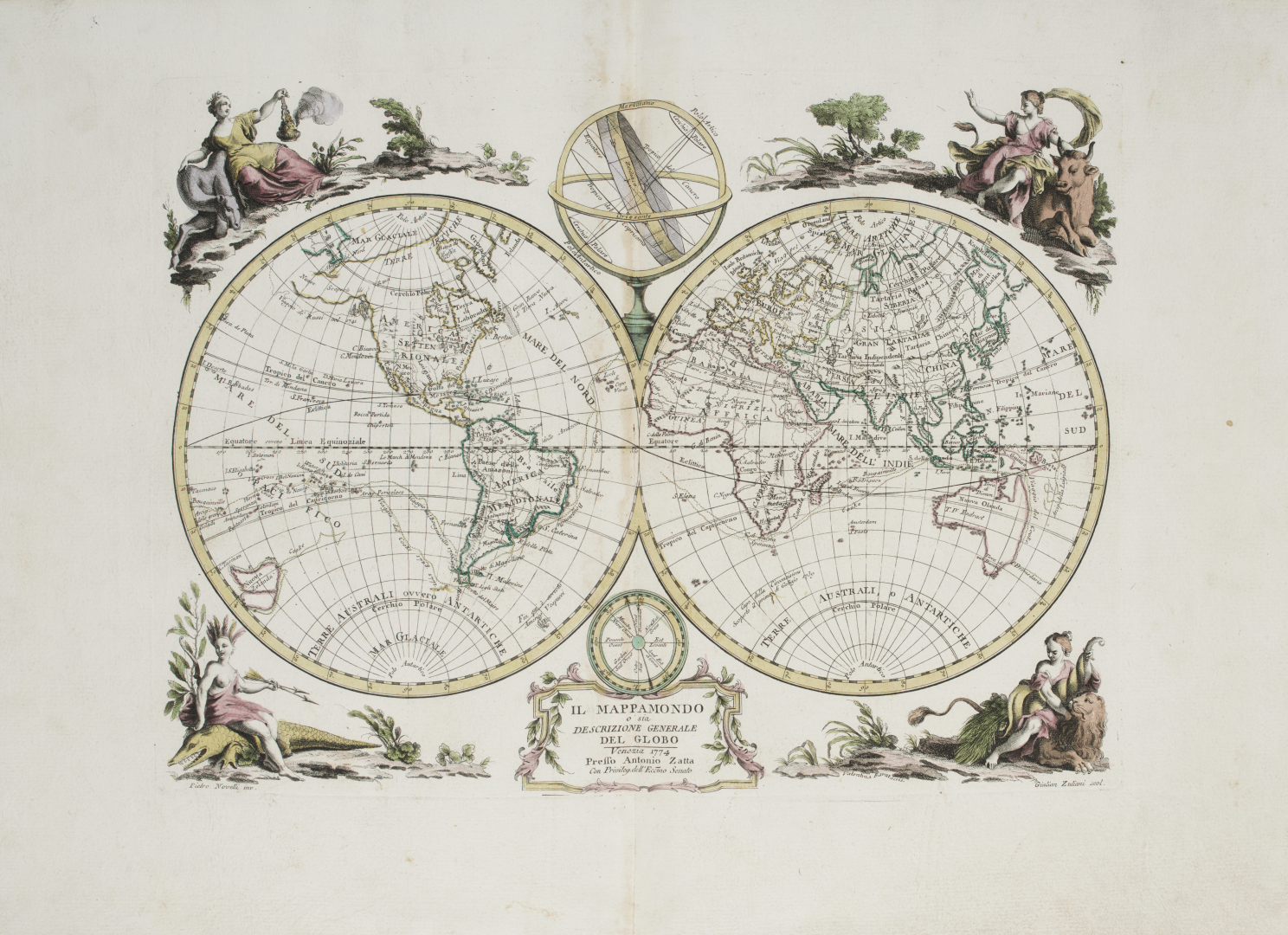 Splendido esemplare della prima edizione, uno dei più affascinanti ed esaustivi atlanti prodotti nel Settecento veneziano, con le sue belle carte geografiche disegnate prevalentemente da Giovanni Pitteri e incise da Zuliani, comprese le 12 carte delle Colonie Unite dell’America Settentrionale di John Mitchell, e le 3 carte con le Nuove scoperte de’ Russi, Nuove scoperte nel Mare del Sud e la Nuova Zelanda. Cremonini pagg. 117-119; Phillips, Atlases, 650.