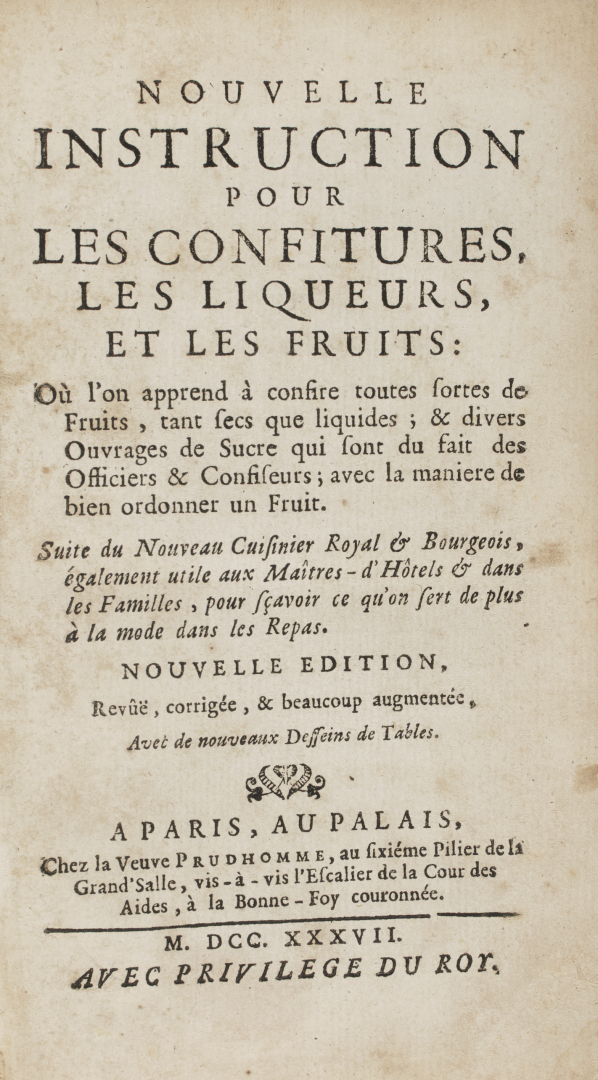 [Gastronomia]. Il bestseller di François Massialot, cioè Nouvelle instruction pour les confitures, les liqueurs, et les fruits nell'edizione di Parigi, stampato da Prudhomme nel 1737, entro legatura coeva pelle. L'autore è stato un maitre famoso che ha servito come chef de cuisine (officier de bouche) per vari personaggi illustri, tra cui Filippo I, duca d'Orléans, fratello di Luigi XIV, e suo figlio Filippo II, duca d'Orléans.