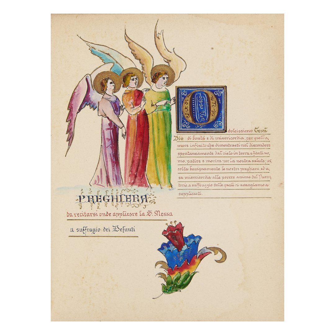 In 12° (132 x 105 mm); [27] carte, protette da velina. Miniature policrome a ogni carta, tra cui numerose iniziali fitomorfe, 3 iniziali istoriate con angeli, un drago e S. Anna in preghiera, uno spartito con preghiera musicata dal maestro Angelo Tonizzo. Legatura in piena pelle bazzana a firma "Legatoria Palombo Bologna", cristogramma IHS al piatto anteriore e motivi fitomorfi impressi ai piatti e al dorso, unghiatura à dentelles, filetti, labbri e tagli in oro (cerniere con leggere abrasioni).